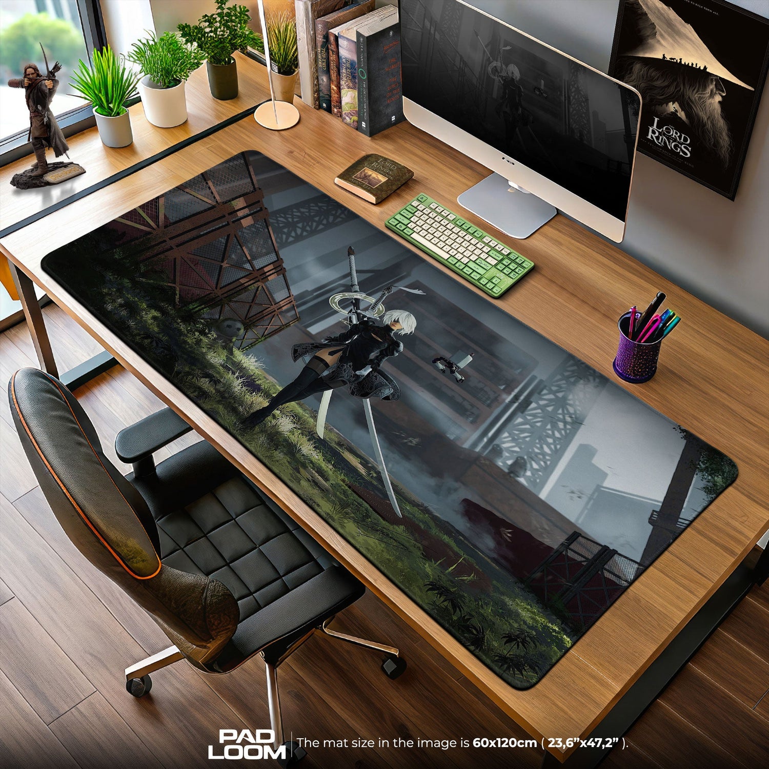 Diese Gaming-Schreibtischmatte wurde für Fans entwickelt, die Ästhetik und Funktionalität gleichermaßen schätzen. Sie passt in jeden Raum, egal ob Sie gerade in einen intensiven Gaming-Marathon vertieft sind oder Ihren täglichen Arbeitsablauf organisieren. Die Kombination aus atmosphärischem Hintergrund und 2Bs imposanter Präsenz verleiht Ihrem Schreibtisch einen einzigartigen Charme und lässt Sie jede Sitzung wie einen Teil ihrer Welt fühlen. Sie erinnert subtil an die Balance zwischen Anmut und Kraft und spiegelt den Geist des Spiels mit jeder Mausbewegung wider.