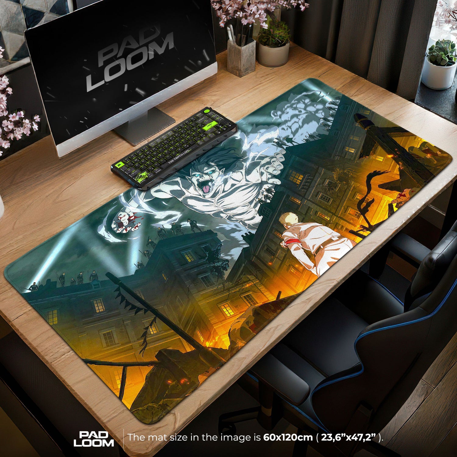 Tauchen Sie Ihren Schreibtisch ein in das Chaos und den Mut von Attack on Titan mit diesem filmreifen Mauspad, das den Moment einfängt, in dem Stärke auf Wut trifft. Ein Titan erhebt sich über der brennenden Stadt, getaucht in grünes und bernsteinfarbenes Licht, während der einsame Soldat unten standhaft bleibt – eine perfekte Hommage an eine der kraftvollsten Schlachten des Animes. Ob Ihre Einrichtung in Neon erstrahlt oder minimalistisch und düster bleibt, diese Matte bringt Tiefe, Bewegung und Gefühl in jeden Rahmen Ihres Arbeitsplatzes.