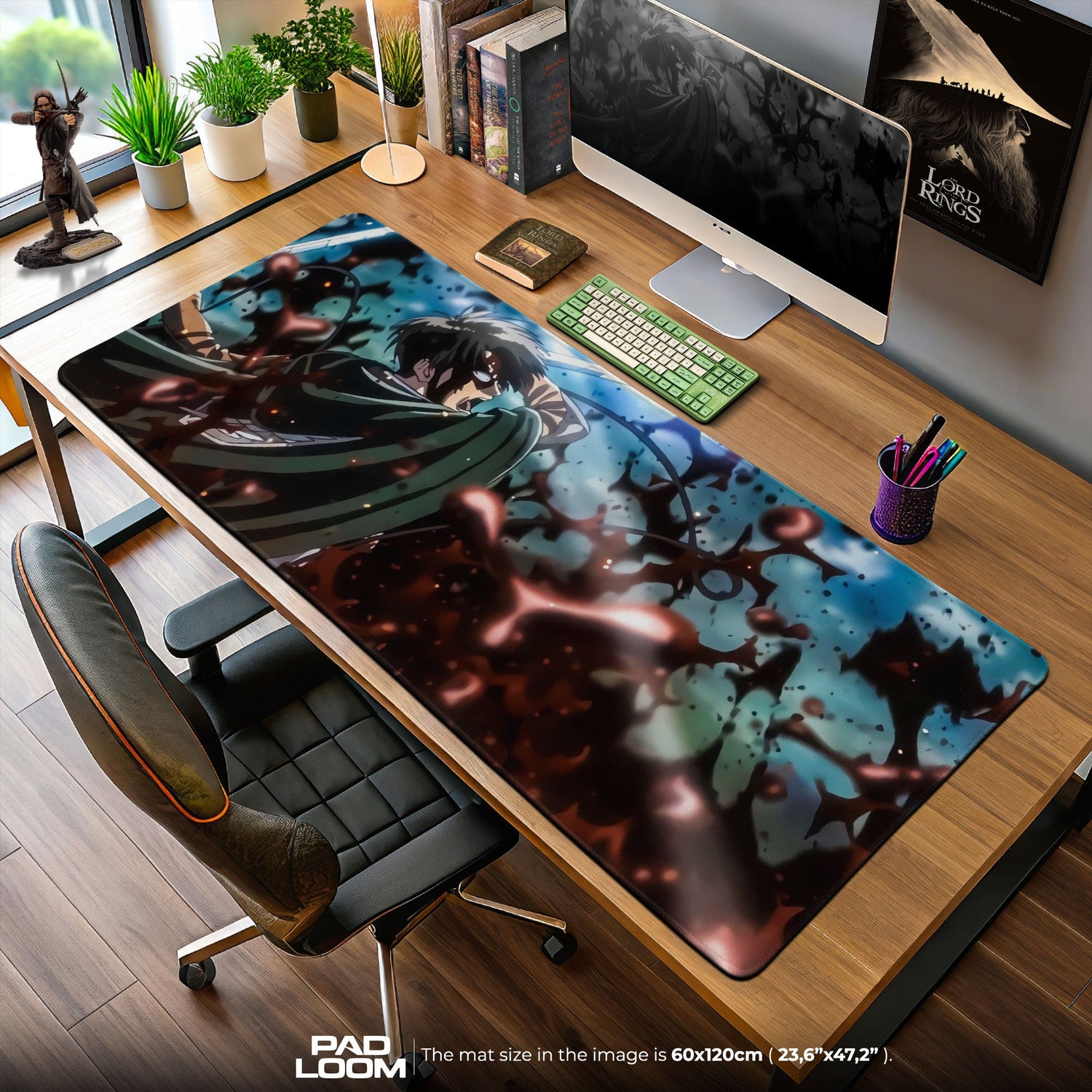 Mitten in fliegenden Trümmern und Chaos bewegt sich eine einzelne Gestalt mit tödlicher Präzision — ruhig, unermüdlich, unaufhaltsam. Dieses von Attack on Titan inspirierte Mauspad fängt den Moment reiner Intensität ein, während die Schlacht tobt und zwischen den Schlägen Stille einkehrt. Die Szene explodiert in tiefem Smaragd- und Purpurtönen, ausbalanciert durch kühle Stahlblau-Nuancen, die Bewegung und Meisterschaft widerspiegeln. Es ist eine Ehrung an Konzentration, Kraft und den Willen des stärksten Beschützers der Menschheit.