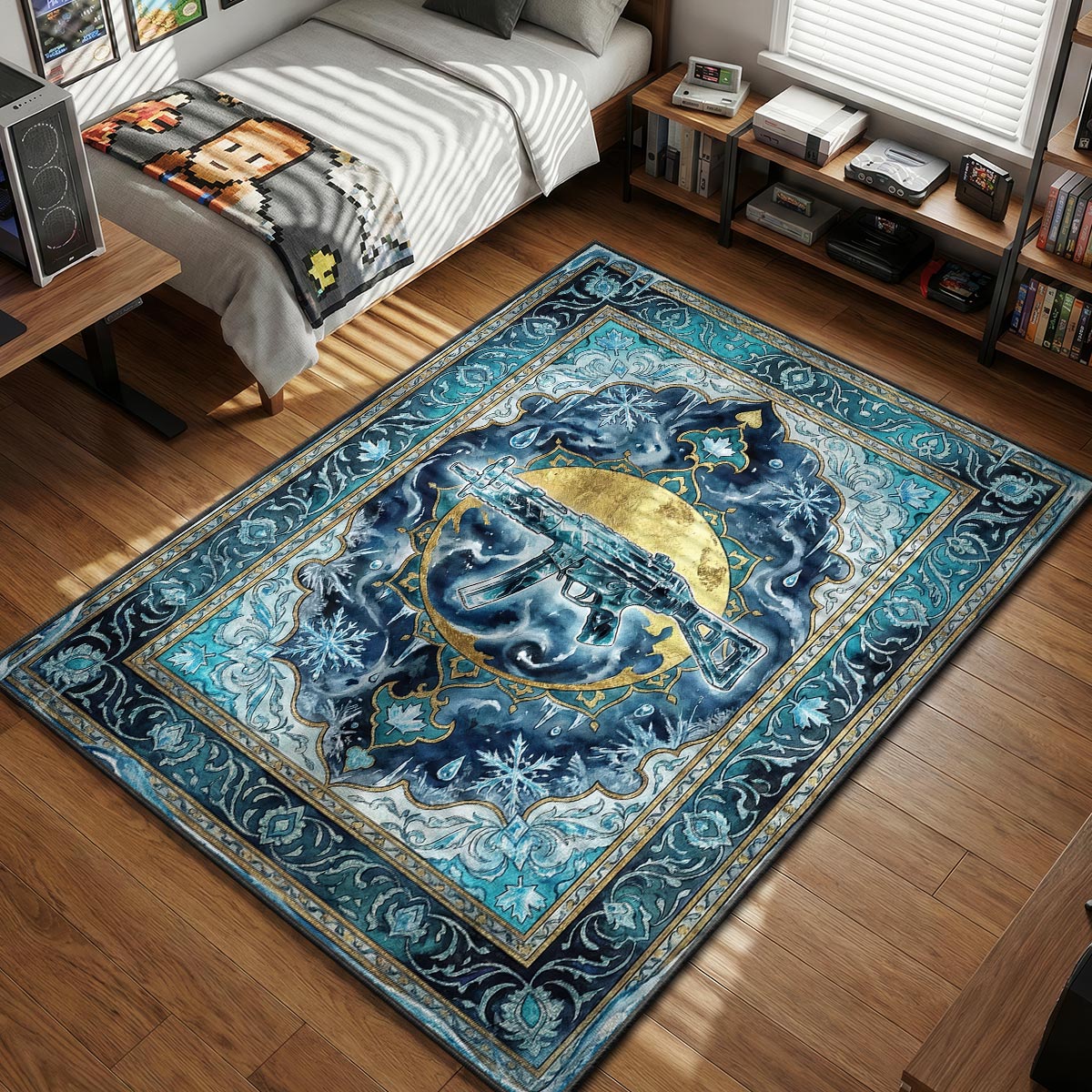 Dies ist nicht nur ein Teppich; es ist eine Trophäe. Das Design ahmt perfekt den Farbverlauf aus tiefen Blautönen, Cyan und klaren Weißtönen nach, wie sie auf der Waffe im Spiel zu sehen sind, eingerahmt von einem klassischen Rand, der dem gefrorenen Chaos einen Hauch von Eleganz verleiht. Der hochauflösende Druck sorgt dafür, dass das Eis tief und kantig wirkt und einen atemberaubenden Blickfang für jedes Zimmer eines FPS-Fans schafft. Über die Optik hinaus ist dies einer unserer hochwertigen rutschfesten Teppiche, die so konstruiert sind, dass sie auch bei einem schweißtreibenden 4-4 Verlängerungs-Matchpunkt fest an Ort und Stelle bleiben. Er bringt die kühle, kalkulierte Atmosphäre eines taktischen Schützen in deinen physischen Raum.