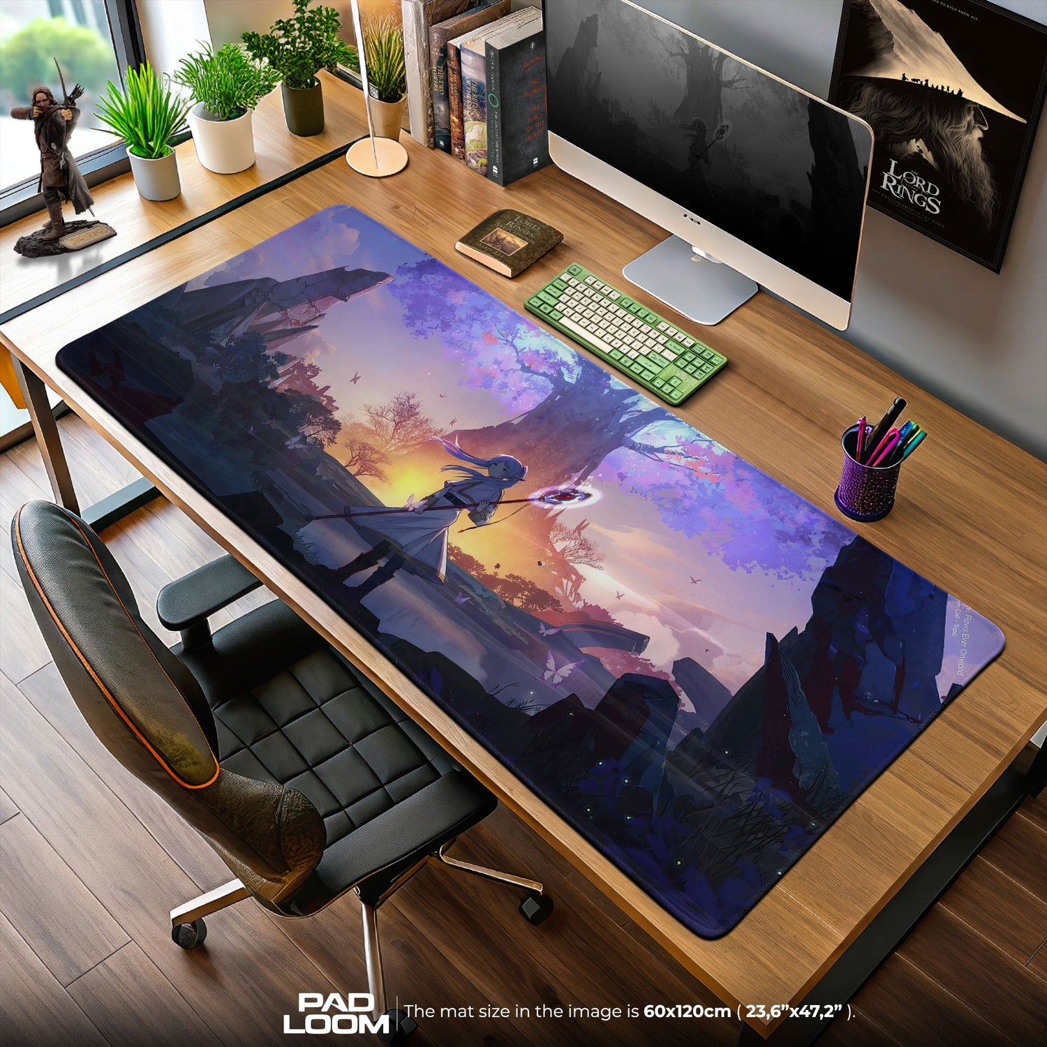 Das Frieren-Dämmerungsbaum-Mauspad zeigt eine atemberaubende Szenerie voller Atmosphäre und Staunen. Vor einem leuchtenden Baum stehend, den Stab in der Hand, ist Frieren vor einem Horizont zu sehen, der in warmen Sonnenuntergangstönen und tiefem Violett gemalt ist. Die mächtigen Äste breiten sich aus und werfen ein ätherisches Leuchten über die umliegenden Felsen und die Landschaft, als hielte die Welt in diesem Moment den Atem an. Das Kunstwerk fängt ein Gefühl von Ehrfurcht, Entdeckung und stiller Einkehr ein und verwandelt deinen Schreibtisch in einen Ort voller Schönheit und Bedeutung.