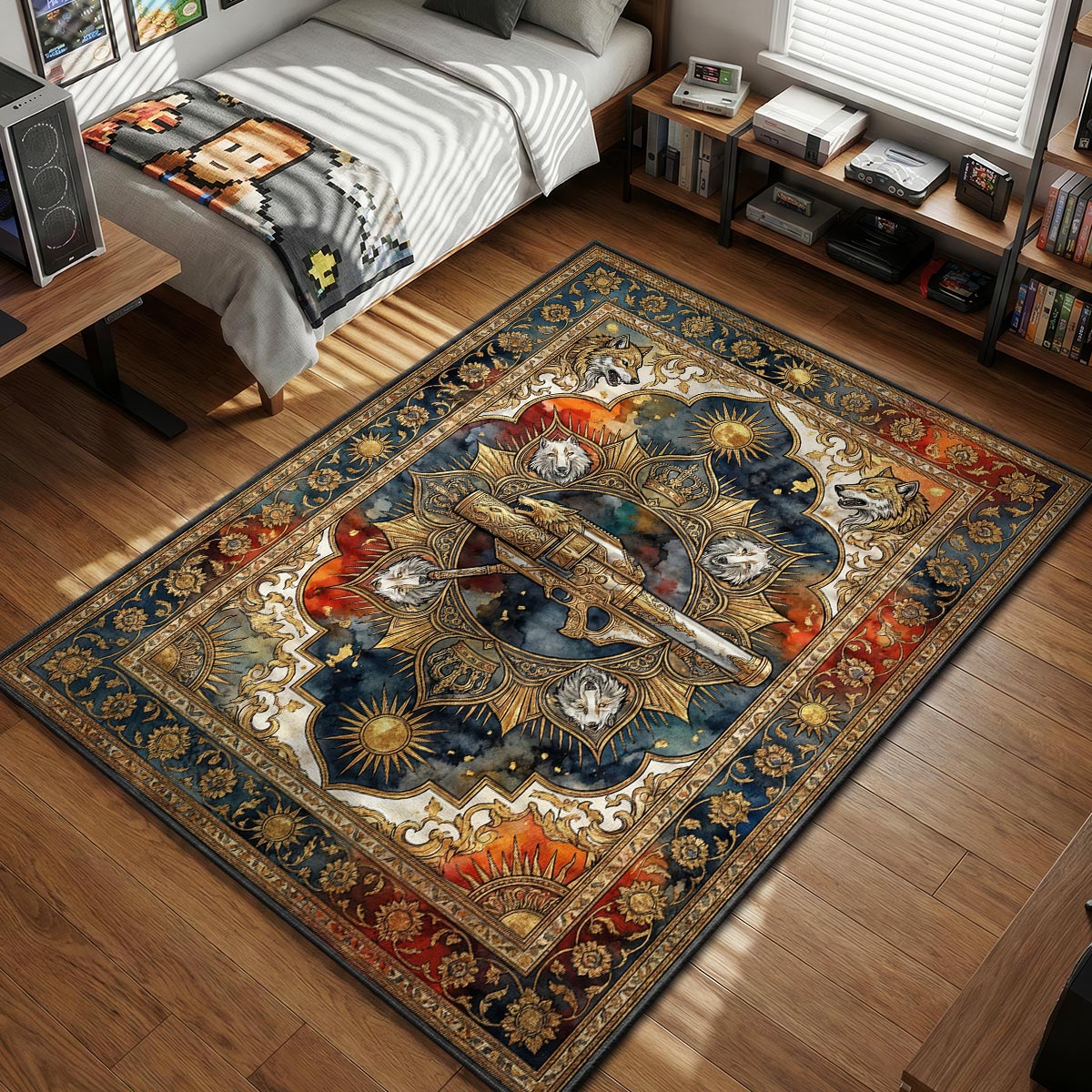 Bringe die Ästhetik der feinsten Handwerkskunst der Letzten Stadt in dein Zimmer. Das Design verbindet tiefes königliches Blau, glühendes Sonnenorange und metallisches Gold zu einer „Beutelschütze“-Stimmung, die sich wahrhaftig Exotisch anfühlt. Es fängt perfekt den prunkvollen Stil der Spiel-Lore-Texte ein und verleiht deinem Spielbereich eine Schicht von Eleganz. Lass deinen Boden nicht gewöhnlicher Beute gleichen; steige auf die Exotische Stufe auf. Entdecke unsere Sammlung von Destiny 2 Matten, um weitere legendäre Ausrüstung für deine Gruppe zu finden. Der hochauflösende Druck sorgt dafür, dass die Wolfsembleme scharf genug sind, um zu heulen.