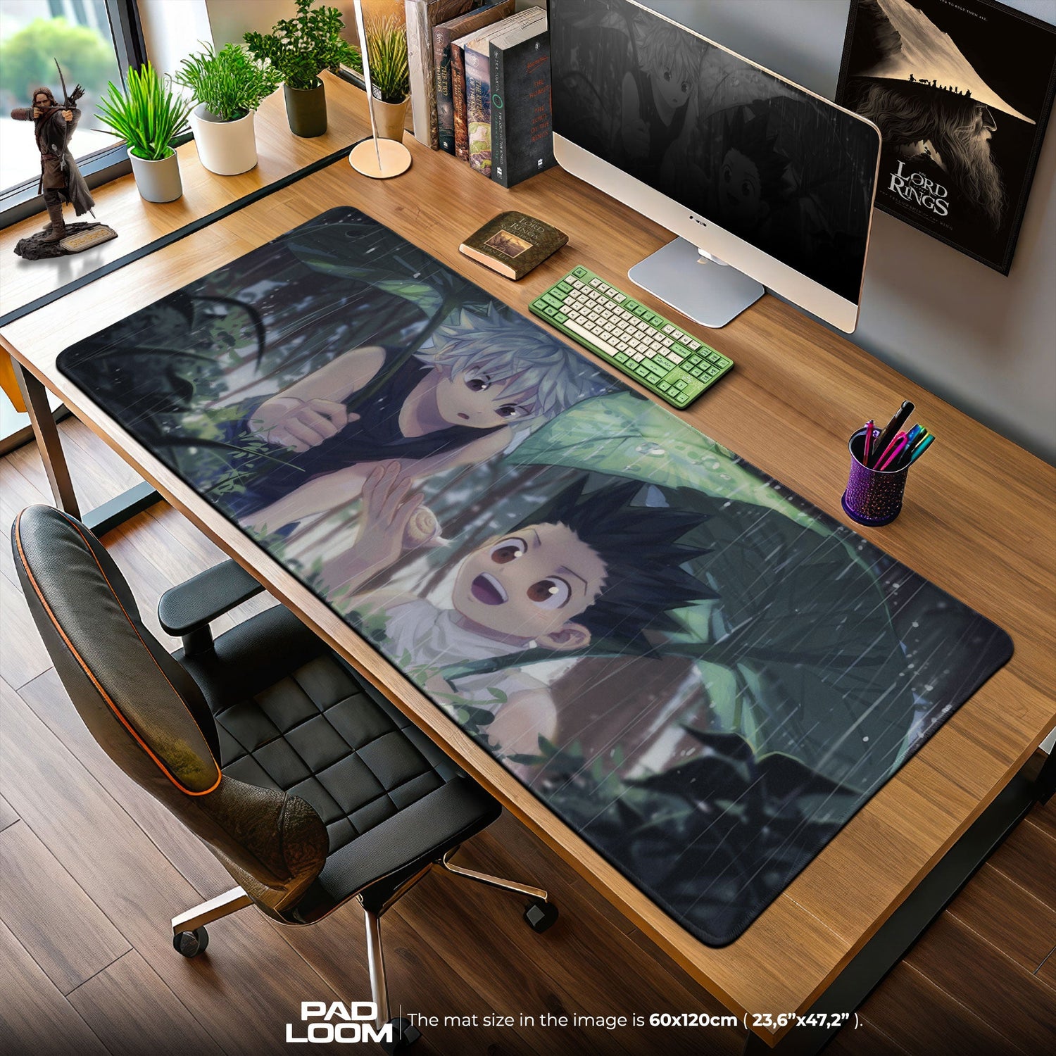 Fange das Wunder von Freundschaft und Entdeckung mit diesem Gon- und Killua-Mauspad ein, eine friedliche Szene, die Ruhe und Neugier ausstrahlt. Das Kunstwerk zeigt die beiden Freunde, die unter breiten Dschungelblättern Schutz suchen, während sanfter Regen um sie herum fällt – ein Moment des Lachens und der Entdeckung, eingefangen in Grüntönen, Grau und sanftem Licht. Die Stimmung ist friedlich und lebendig zugleich, sie weckt das Gefühl einer stillen Verbindung zur Natur und den Nervenkitzel des Abenteuers, der ihre Reise prägt.
