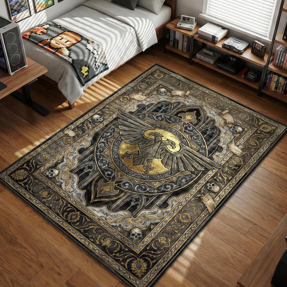 Das Design fängt die schwere, brutalistische Schönheit der Architektur des 41. Jahrtausends ein. Vor einem Hintergrund aus dunklen gotischen Bögen und verwitterten Pergamentrollen hebt sich der goldene Adler mit einem dreidimensionalen, strukturierten Aussehen hervor. Er bringt die düstere Finsternis der fernen Zukunft in Ihr Zuhause, ohne übermäßig chaotisch zu wirken, und bietet eine nüchterne und „finstere“ Ästhetik. Er dient als anspruchsvoller Anker für Ihre Einrichtung und ist einer unserer strapazierfähigen waschbaren Bodenmatten, die Schmutz und Abnutzung wirkungsvoll verbergen.