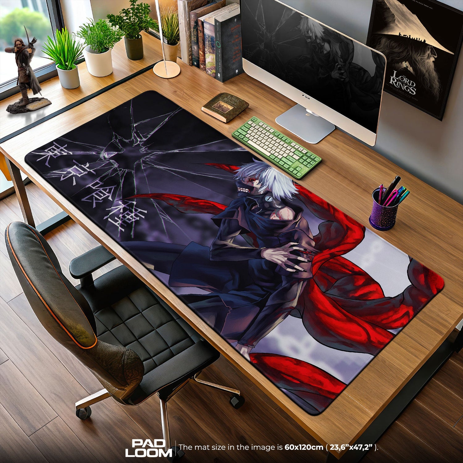 Tauche ein in die dunkle Schönheit der Verwandlung mit diesem Kaneki-Mauspad, einer atemberaubenden Darstellung von Stärke, die aus dem Kampf geboren wurde. Das Kunstwerk zeigt Kaneki in seiner erwachten Ghoul-Gestalt – seine Maske glänzt unter zerbrochenem Glas, blutrote Kagune winden sich wie lebendige Flammen um ihn herum. Der Hintergrund verblasst in tiefen Violett- und Grautönen, während leuchtendes Rot und Schwarz in Bewegung aufeinandertreffen und Chaos, Kraft sowie zerbrechliche Kontrolle hervorrufen. Es ist ein Design, das Emotion und Intensität ausstrahlt und jeden Schreibtisch in einen Raum voller Geschichte und Energie verwandelt.