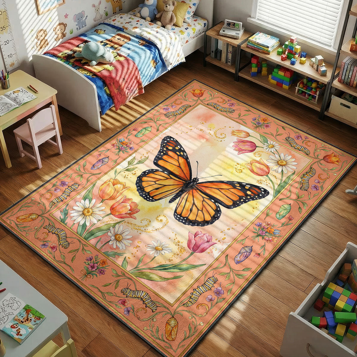 A stunning Monarch butterfly spreads its vibrant orange wings at the center of this beautiful garden inspired rug. Surrounding flowers, daisies, tulips, and soft watercolor details create a peaceful nature scene full of life. The decorative border includes playful caterpillars and chrysalis illustrations, celebrating the magical butterfly life cycle. This charming nature artwork makes a wonderful addition to colorful bedrooms and creative spaces within our kids room rugs collection.