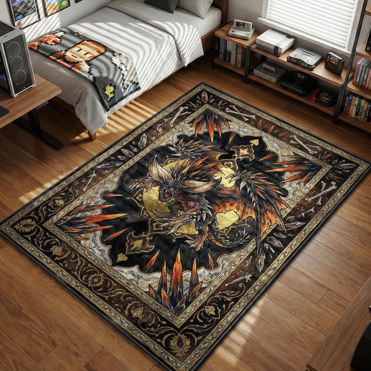 Dieses Design ist nicht nur ein Teppich; es ist eine Warnung an jeden, der dein Reich betritt. Das Kunstwerk verbindet dunkle Fantasieelemente mit der rohen Brutalität von Monster Hunter World und zeigt einen Rand aus Knochen und Dornen, der das Ungeheuer einrahmt. Die dunkle Farbpalette – satte Schwarztöne, Brauntöne und feurige Orangetöne – verleiht deinem Raum eine raue, spannungsgeladene Atmosphäre. Es gehört zu unseren eindrucksvollsten waschbaren Teppichen und ist perfekt, um in deiner Spielstation oder deinem Stream-Hintergrund eine ernste „Schwer-Modus“-Stimmung zu schaffen.