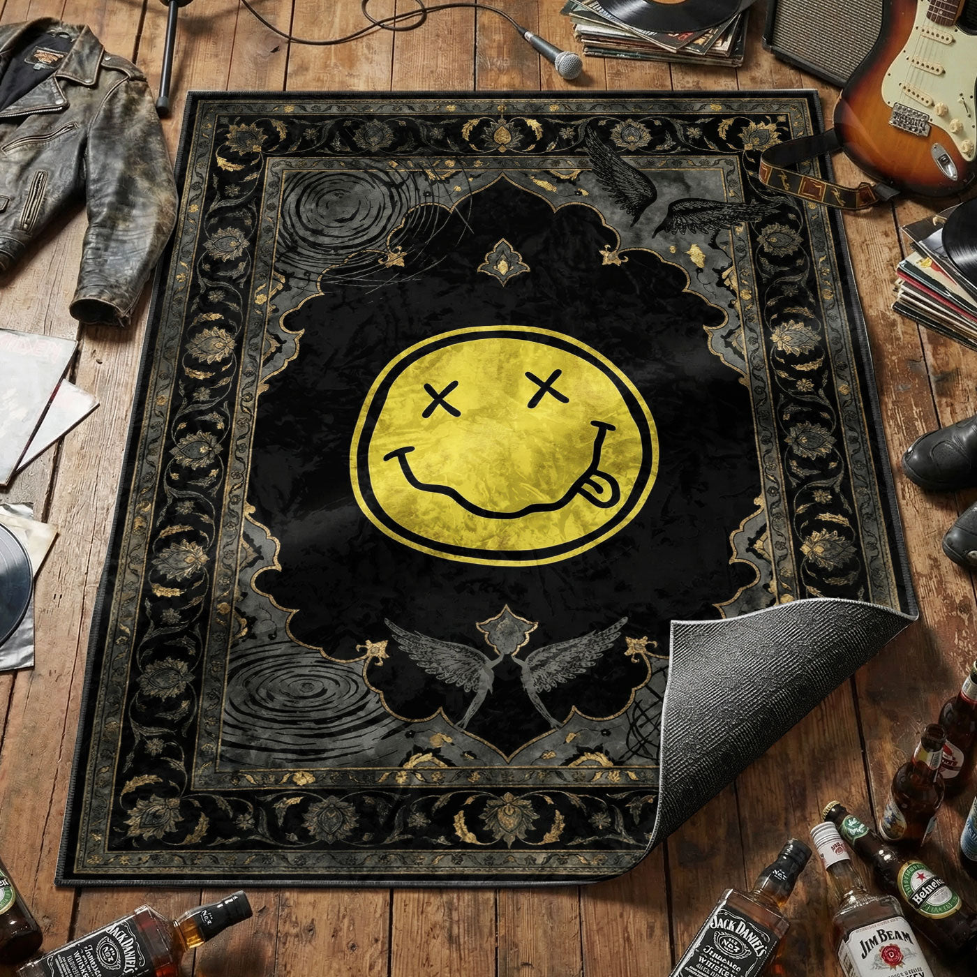 Ausgestrichene Augen und ein schiefes Grinsen – das Nirvana-Smiley sitzt auf einem Feld aus reinem Schwarz und leuchtet gelb gegen die Leere. Darum herum breiten sich graue Engelsflügel vom unteren Medaillon aus, Wasserwellen hallen von unten links wider, und verworrene Kritzel-Linien füllen oben rechts wie Störgeräusche auf einem toten Kanal. Der Rand ist dunkel mit gedämpften Goldblatt-Akzenten und traditionellem floralen Rankenwerk in Kohletönen. Grunge destilliert in einem einzigen Bild auf einem Teppich. Kein Überfluss. Kein Getue. Fünf Teppichgrößen, drei Stuhlmatten-Größen — entdecke Teppiche für deinen Raum.