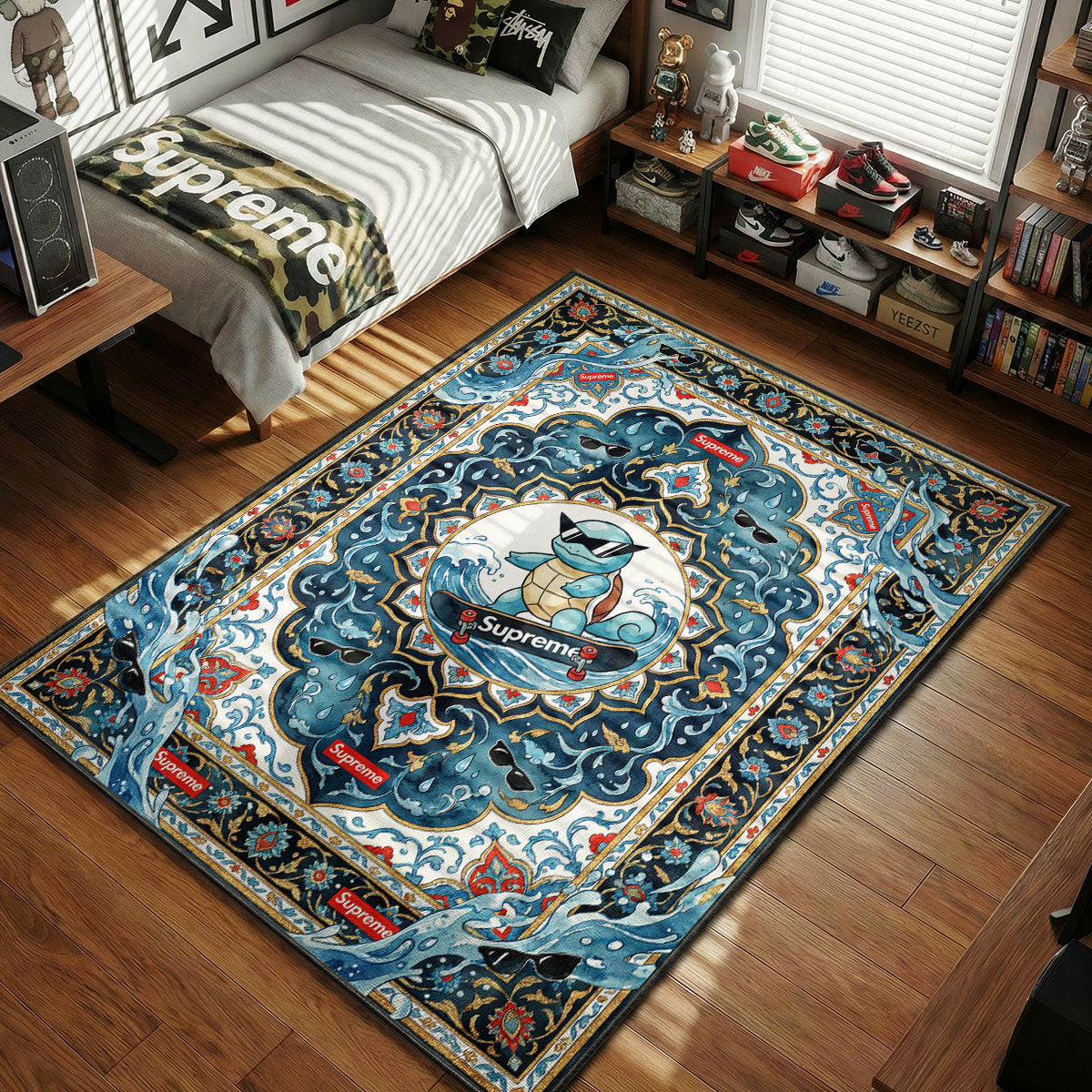 Pokemon Squirtle wearing sunglasses skating on Supreme board blue water Persian hypebeast area rug