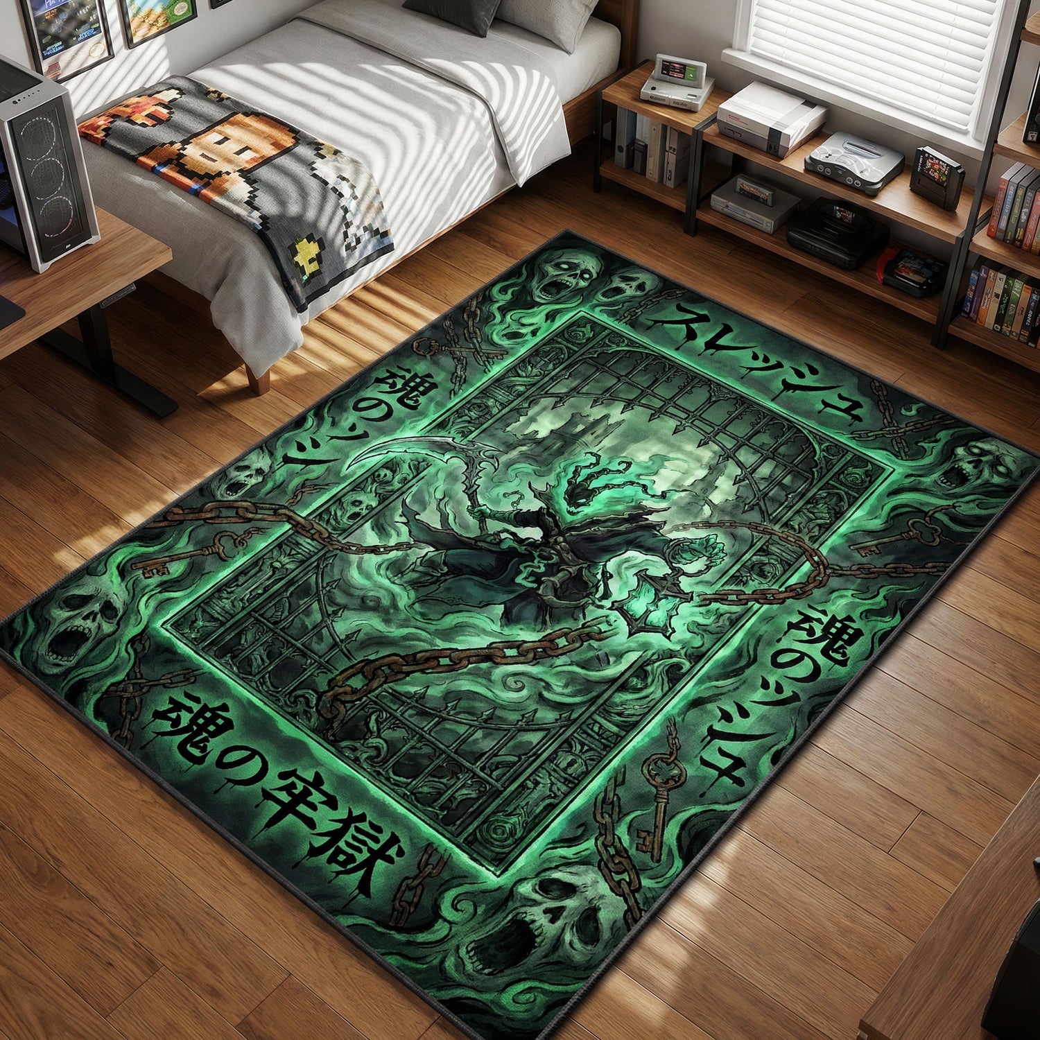 Tauchen Sie Ihren Raum in das unheimliche Leuchten des Schwarzen Nebels. Dieser Teppich wird von geisterhaften Grüntönen, tiefem Schwarz und skelettgrau beherrscht und schafft eine frostige, gotische Stimmung. Das Kunstwerk ist reich an Details – von den qualvollen Gesichtern gefangener Seelen bis zu den rostigen Ketten und uralten Schlüsseln am Rand. Es ist ein eindrucksvolles Stück Spielerbereich Teppiche, perfekt für Spieler, die eine düstere, bedrohliche Atmosphäre einem grellen RGB-Licht vorziehen.
