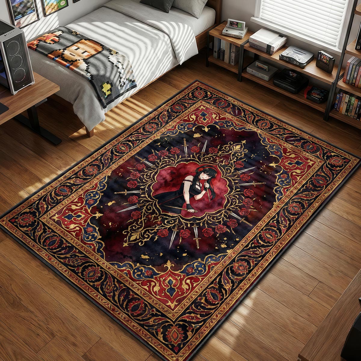 Dieser Teppich ist ein Meisterstück gotischer Schönheit. Die zentrale Abbildung von Yor ist umgeben von einem strahlenförmigen Kranz aus Dolchen und blühenden roten Rosen, die ihre tödliche Schönheit symbolisieren. Der Hintergrund ist ein reiches Gewebe aus tiefem Purpurrot, Mitternachtsblau und goldenen Verzierungen, das einen luxuriösen persischen Stil schafft, der perfekt in ein hochwertiges Spielzimmer oder Schlafzimmer passt. Er verwandelt Ihren Boden in ein Blickfangstück, das die Intensität einer Actionserie mit der Eleganz traditioneller waschbarer Teppiche verbindet.