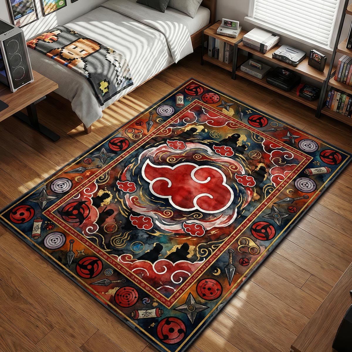 This design masterfully captures the dark allure of the Akatsuki. The border is a treasure trove of lore, showcasing the fearsome Dojutsu eyes—including the Rinnegan and various Sharingan patterns—alongside ninja tools like kunai and shuriken. The deep reds, ominous blacks, and muted gold accents create a striking visual contrast that demands attention. It is the ultimate piece of anime room rugs for those who prefer the complex morality of the villains over the shining optimism of the heroes.