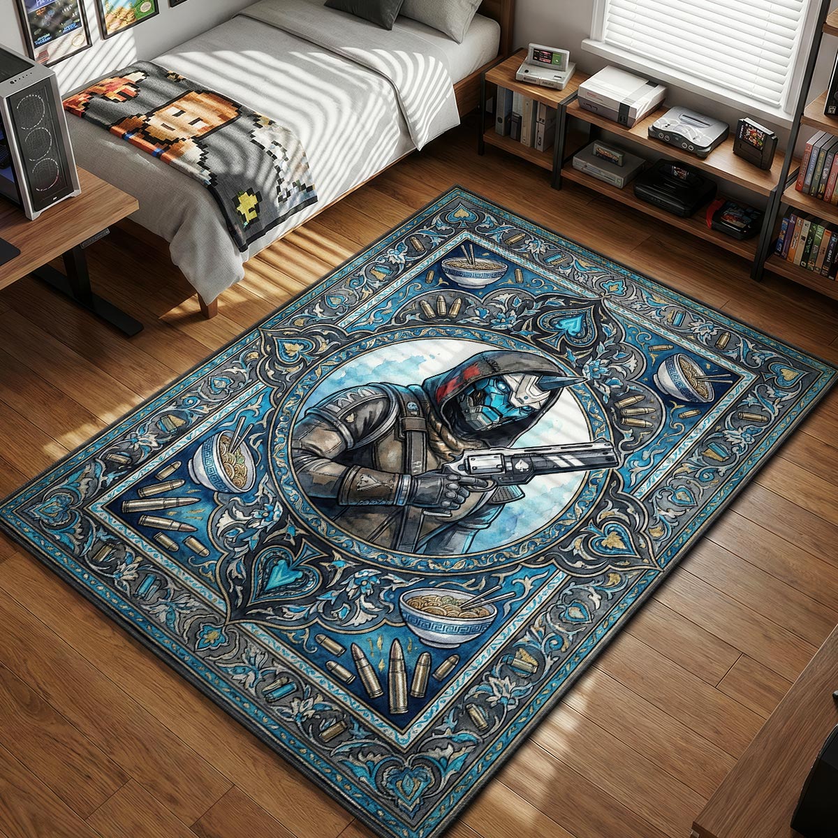 "I'm coming home, Ace." Keep the memory of the Last City's most beloved Exo alive with this stunning tribute design. Featuring Cayde-6 in his signature hooded cloak, clutching the legendary Ace of Spades, this rug is a love letter to the Forsaken era and the original Tower crew. The artwork is packed with Easter eggs for true fans, including the iconic Spade symbol and bowls of his favorite Spicy Ramen tucked into the ornate corners. It’s more than just decor; it’s a memorial to the sharpest wit in the solar system, perfect for any Hunter main looking to pay respects in their gaming den.