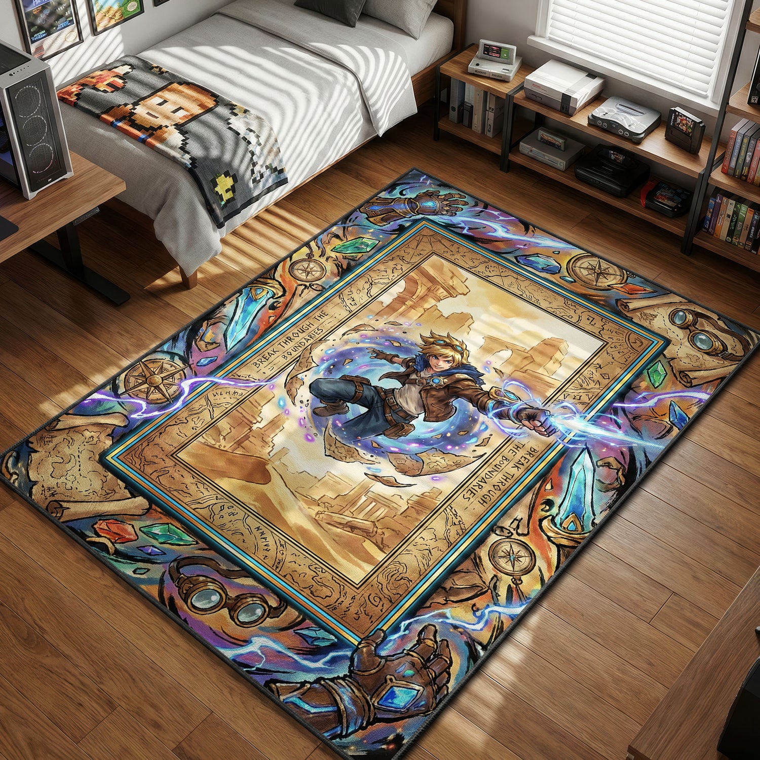 Forget boring floors; transform your space into a scene from Shurima or Piltover. The intricate border art is packed with adventurous details—ancient maps, compasses, goggles, and scattered crystals—framing the action perfectly. The text "Break Through The Boundaries" is emblazoned on the sides, motivating you to push past your limits in every match. Printed with high-definition clarity, the vibrant blues of the arcane magic contrast sharply against the parchment-colored background, making it a standout piece of gaming setup decor that captures the spirit of adventure.
