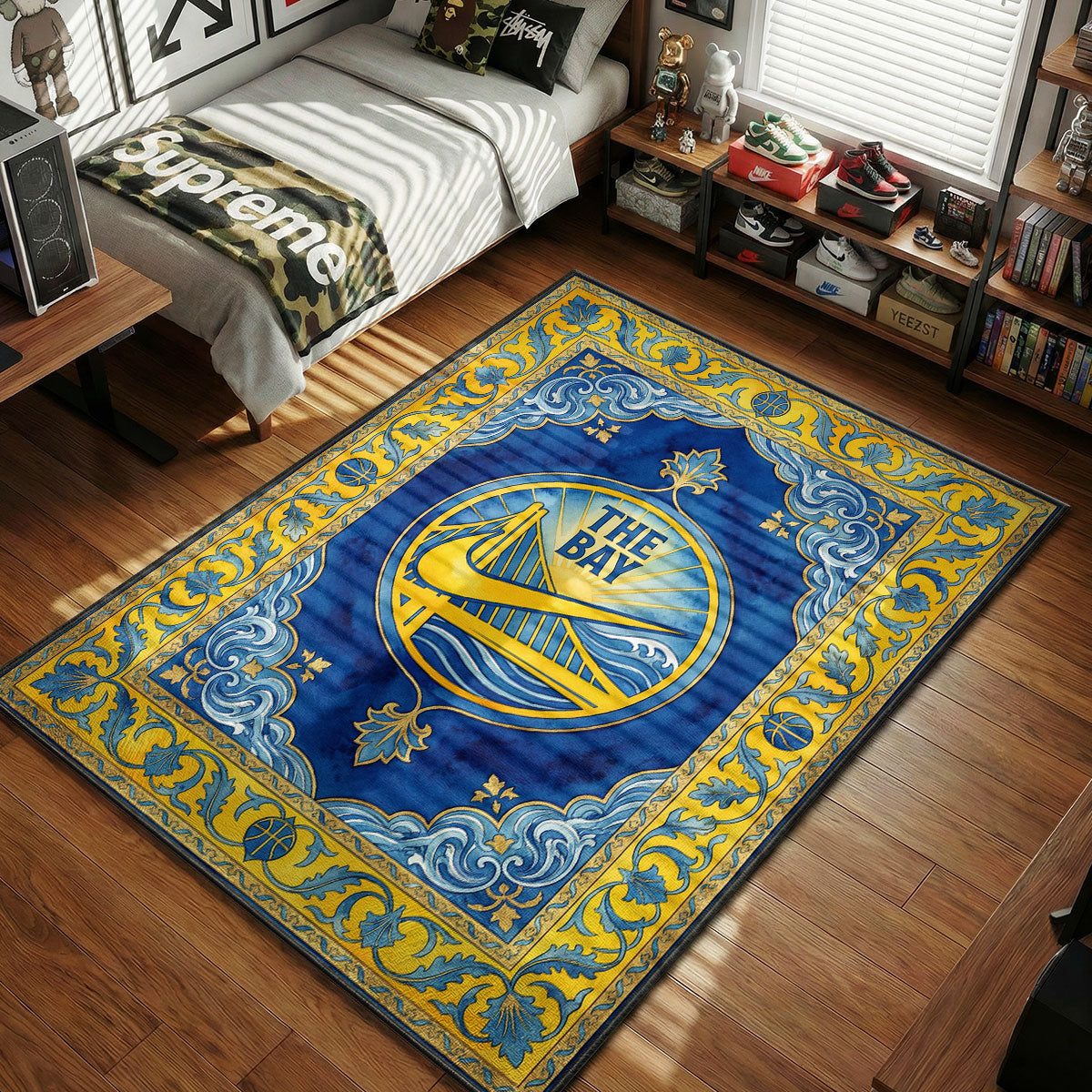 The Golden Gate Bridge silhouette anchors the center, framed by layered ocean wave motifs and a deep blue backdrop that adds visual depth. Surrounding it is an intricate gold vine border with basketball accents woven into the pattern, giving the design a tapestry-inspired finish. The combination of coastal symbolism and detailed scrollwork makes this rug a natural fit for game rooms, sneaker displays, dorm setups, or any Warriors-inspired space. If you’re building around statement hypebeast rugs, this one carries Bay Area pride without overcomplicating the look.