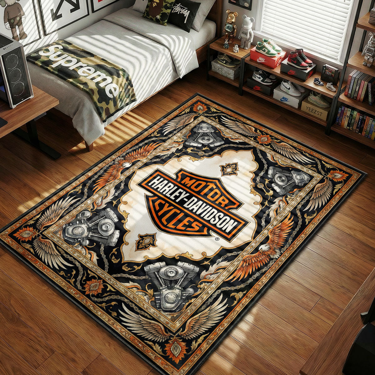 The Harley-Davidson Motor Cycles Bar & Shield logo commands the center, framed by roaring V-twin engines and spread eagle wings. Orange and black detailing punches through a vintage ornamental backdrop, channeling pure Milwaukee steel. Chains, pistons, and feathered power lock into a design that salutes American cruiser culture. Tap into more iconic biker heat inside our harley davidson rugs collection.