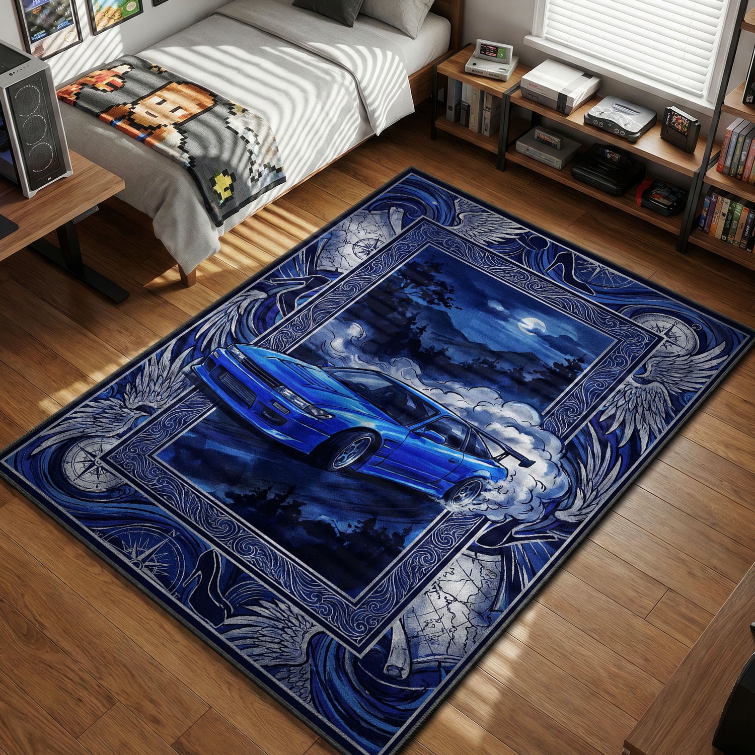 Bring the atmospheric tension of a midnight battle into your living space. The deep, rich indigo tones and the misty, moonlit background perfectly capture the vibe of the Usui touge at night. The dynamic smoke effects and the aggressive stance of the SilEighty create a sense of motion that makes your room feel faster. Whether you are building a racing simulator cockpit or just want to add some JDM flair to your office, this piece serves as premier anime floor decor, turning a boring floor into a scene straight out of the anime’s most memorable battles.