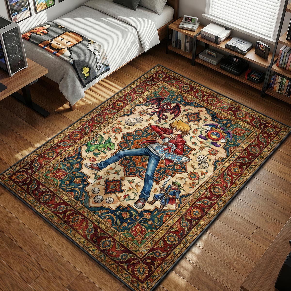 This rug cleverly integrates Joey's gambling theme into a sophisticated, traditional aesthetic. The central cream field is scattered with gaming dice, symbolizing his reliance on luck, while the surrounding monsters—including the Swordsman of Landstar—add character and charm. The intricate red and blue floral borders frame the action beautifully, giving the piece a vintage feel that elevates it above standard merchandise. It serves as one of our most distinct accent floor rugs, blending the nostalgia of the anime with a design that fits seamlessly into a stylish home decor.