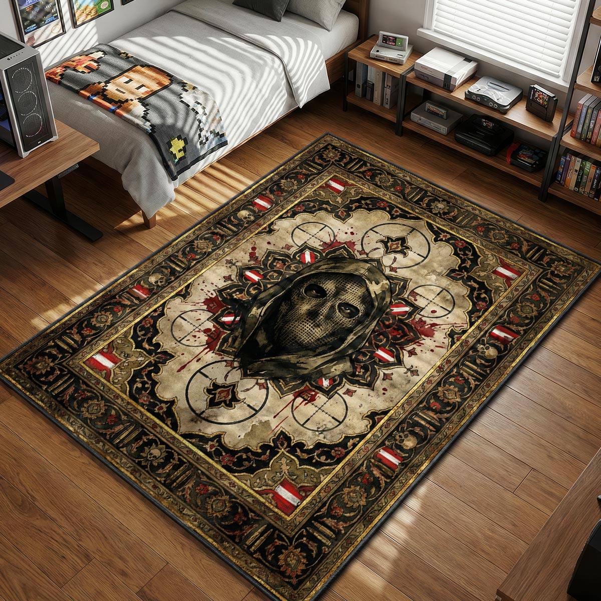 Silence is violence. This rug features the imposing portrait of König, the fan-favorite KorTac operator from Modern Warfare II and Warzone. Known for his massive stature and the signature sniper veil that hides his face, König represents the lethal precision of the Austrian Jagdkommando special forces. The design captures his stoic, menacing gaze through the mesh mask, making it a must-have for players who main this giant on the battlefield. It’s a tribute to the mystery and brute force of the operator who executes orders without hesitation. Browse our full collection of Call of Duty rugs to assemble your squad.