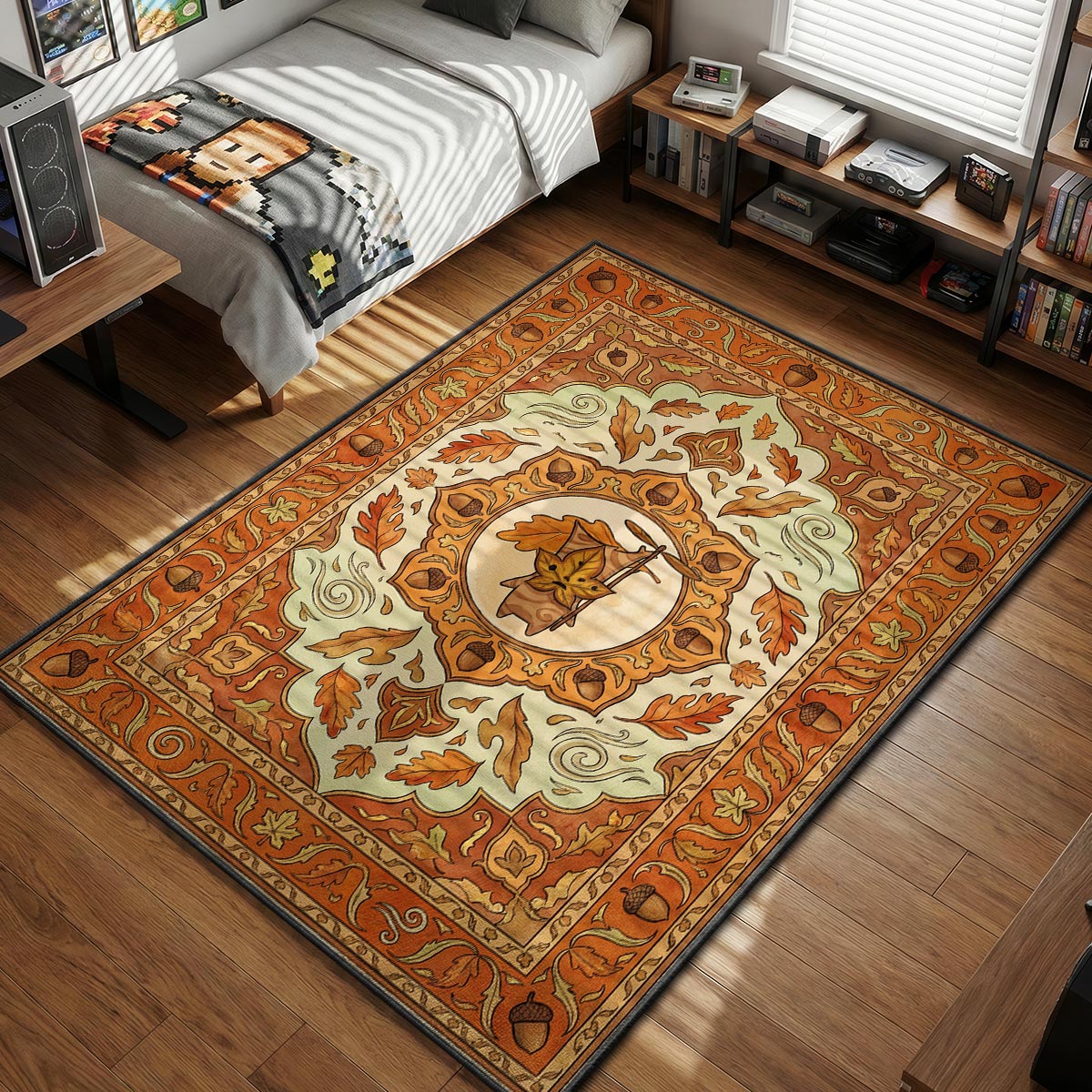 Bring the warmth of the Lost Woods into your home without getting lost in the mist. The design utilizes a soothing palette of earthy browns, creamy beiges, and harvest oranges, creating a "cozy gamer" vibe that fits perfectly with a wood-desk setup or a cottagecore aesthetic. The intricate border is laden with acorns and stylized foliage, blending traditional rug motifs with Nintendo magic. It stands out as one of our most inviting accent floor rugs, perfect for adding a touch of nature and warmth to a cold technology-filled room.