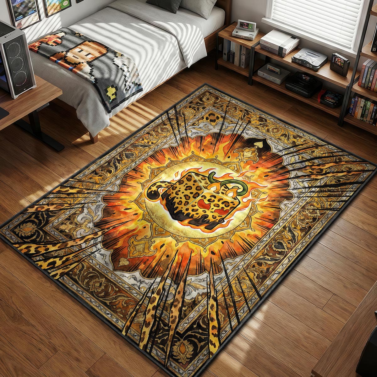This rug is a collision of wild beast mode and sophisticated design. The fiery orange and yellow flames erupting from the center are slashed through with jagged claw marks, creating a sense of motion and impact. This chaotic energy is contained within an elegant, vintage Persian-style border, creating a striking contrast that looks incredible in any room. It’s a visual representation of "controlled chaos," perfect for gamers who want washable floor mats that reflect their aggressive playstyle while still looking premium on the floor.