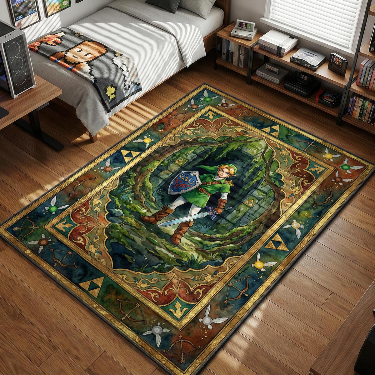 It’s dangerous to go alone, so take this rug with you. Featuring a stunning, painterly depiction of Link standing resolute within a stone archway, this design captures the essence of Hyrule's greatest adventures. Armed with the Master Sword and Hylian Shield, the Hero of Time is framed by ancient vines and the sacred Golden Power. Whether you are replaying Ocarina of Time or exploring the depths of Tears of the Kingdom, this piece is the ultimate loot drop for your floor. It’s more than just decor; it’s a portal to Hyrule, making it the definitive Zelda rug for any serious fan looking to honor the Triforce of Courage.