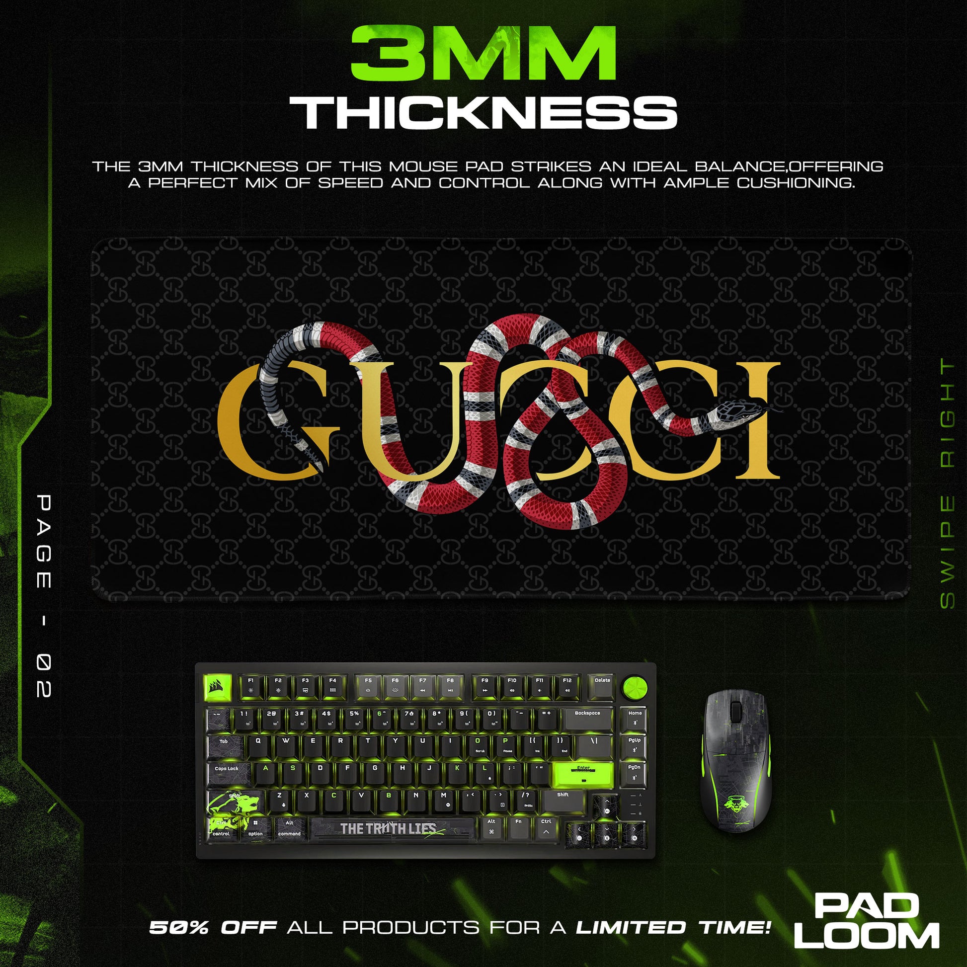 Engineered with a 3mm thickness, it strikes the perfect balance between plush cushioning and precise responsiveness. The micro-woven surface delivers exceptional glide and tracking accuracy, while stitched anti-fray edges ensure long-term durability. A non-slip rubber base anchors it firmly to your desk, providing total stability during intense gaming or workflow sessions. The fade-resistant design maintains its deep blacks and vivid serpent detailing over time.