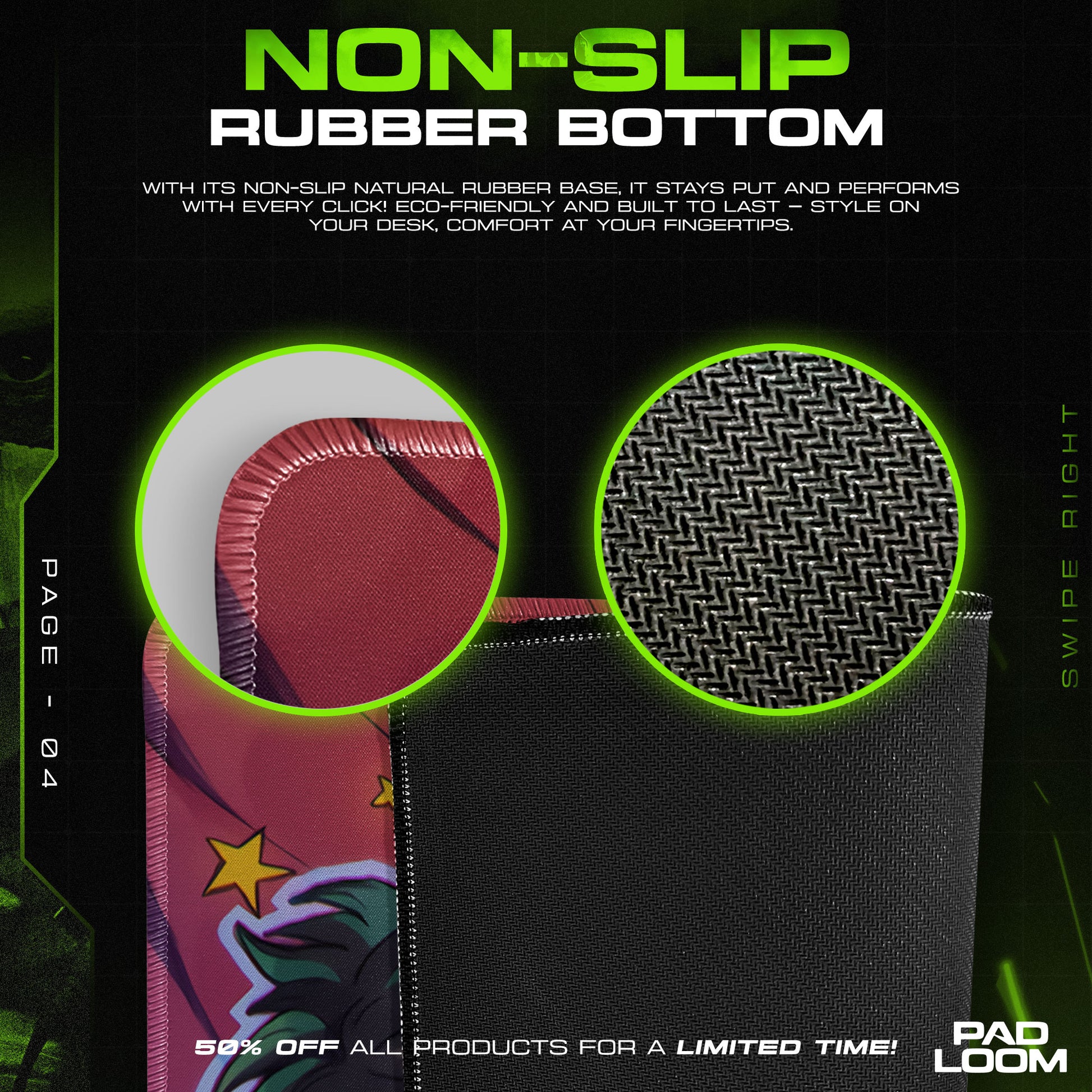 The mouse pad is built for performance as much as style. Its smooth surface ensures quick, responsive mouse movement, perfect for gamers who thrive on precision and speed. The 3mm cushioning provides wrist support and comfort during long hours of use, while the non-slip rubber base keeps the mat steady through even the most intense gaming sessions. The wide format offers ample space for your keyboard and mouse, tying together functionality with striking anime visuals.