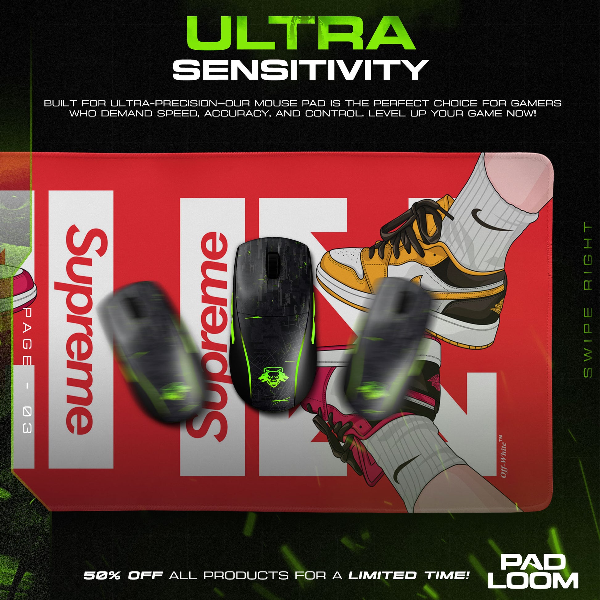The Nike Supreme Mouse Pad brings together two worlds — high-performance streetwear and bold design. A vivid red backdrop sets the stage for striking white directional graphics and the unmistakable “Supreme” style branding, flanked by sneakers in red, yellow, and black. Every detail pulses with energy, from the contrast of colors to the confident balance of movement and minimalism. It’s the perfect centerpiece for gamers and creatives who treat their workspace like a statement of culture.