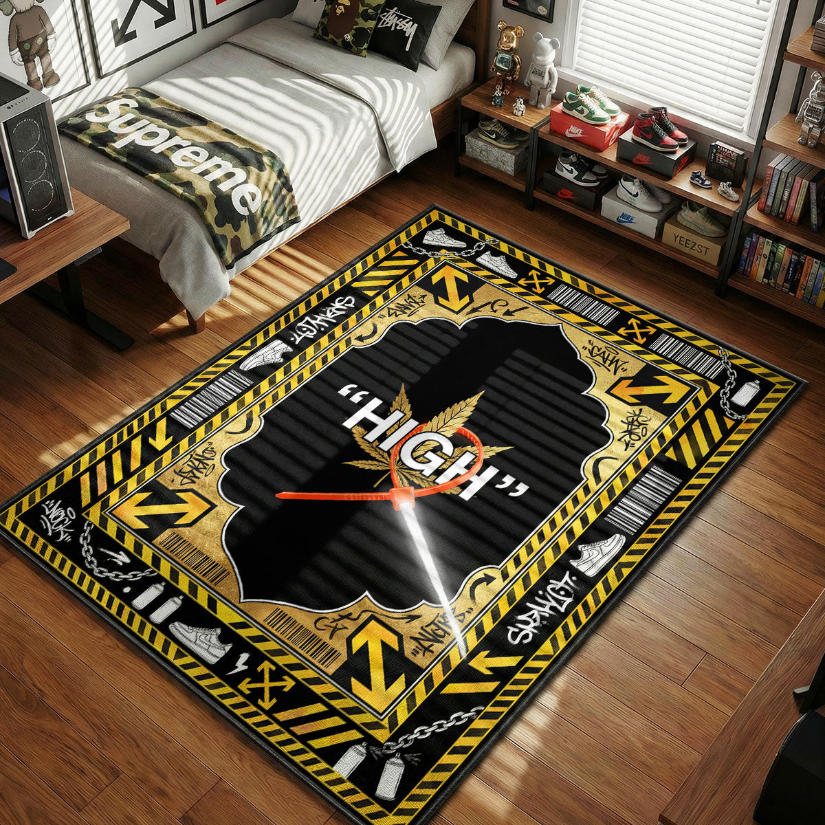 Virgil's signature industrial aesthetic crashes heavily into cannabis culture. A bold "HIGH" quote sits dead center, pierced by an iconic orange zip tie over a golden botanical leaf. Explore our exclusive lineup of off white rugs to secure this unapologetic designer energy for your personal space.
