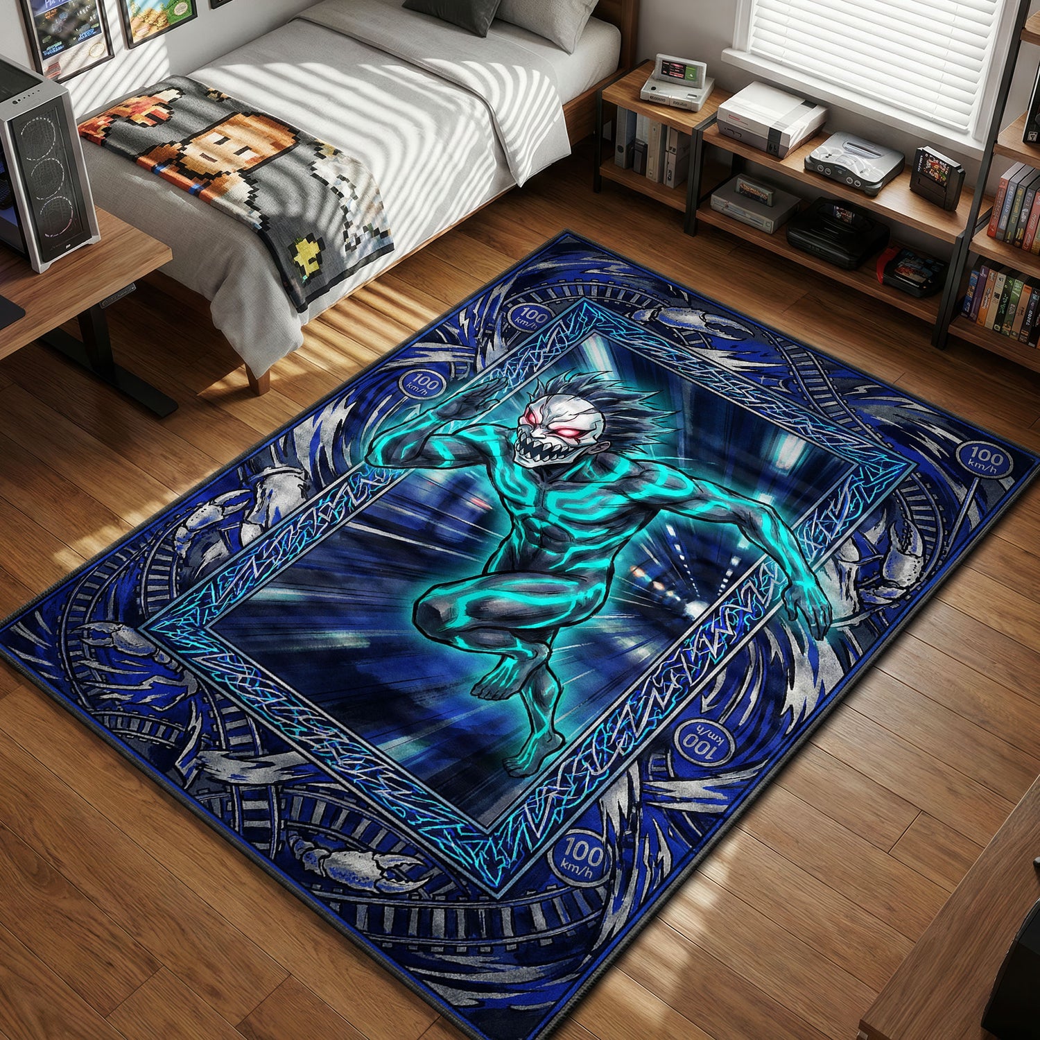 Q: Will the bright cyan lightning details look blurry in person? A: No, the image is printed using high-definition dye sublimation. This ensures that the "motion blur" artistic effect looks intentional and sharp, while the solid lines of the character remain crisp and vibrant.