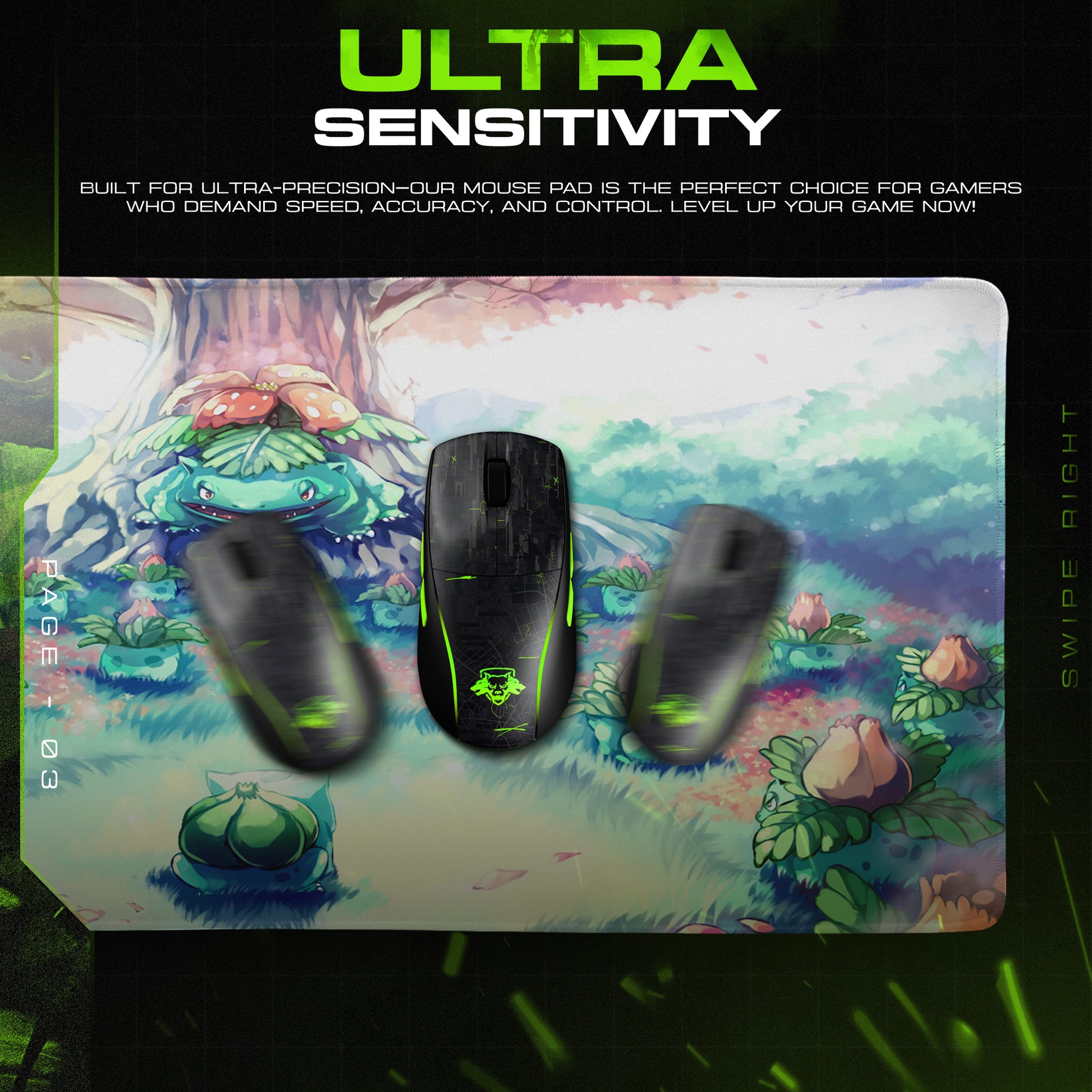 A quiet clearing bathed in morning light, leaves swaying gently in the breeze—this Bulbasaur-themed mouse pad transports you to a hidden sanctuary where nature thrives in peaceful harmony. At the heart of it all rests a wise and watchful Venusaur beneath an ancient tree, surrounded by a playful circle of Bulbasaurs and Ivysaurs. The lush grass, the pink petals scattered like confetti, and the soft, dreamy color palette make the entire scene feel like a moment frozen in a storybook. It’s a celebration of growth, community, and the quiet strength found in nature—brought to life through stunning anime artwork.