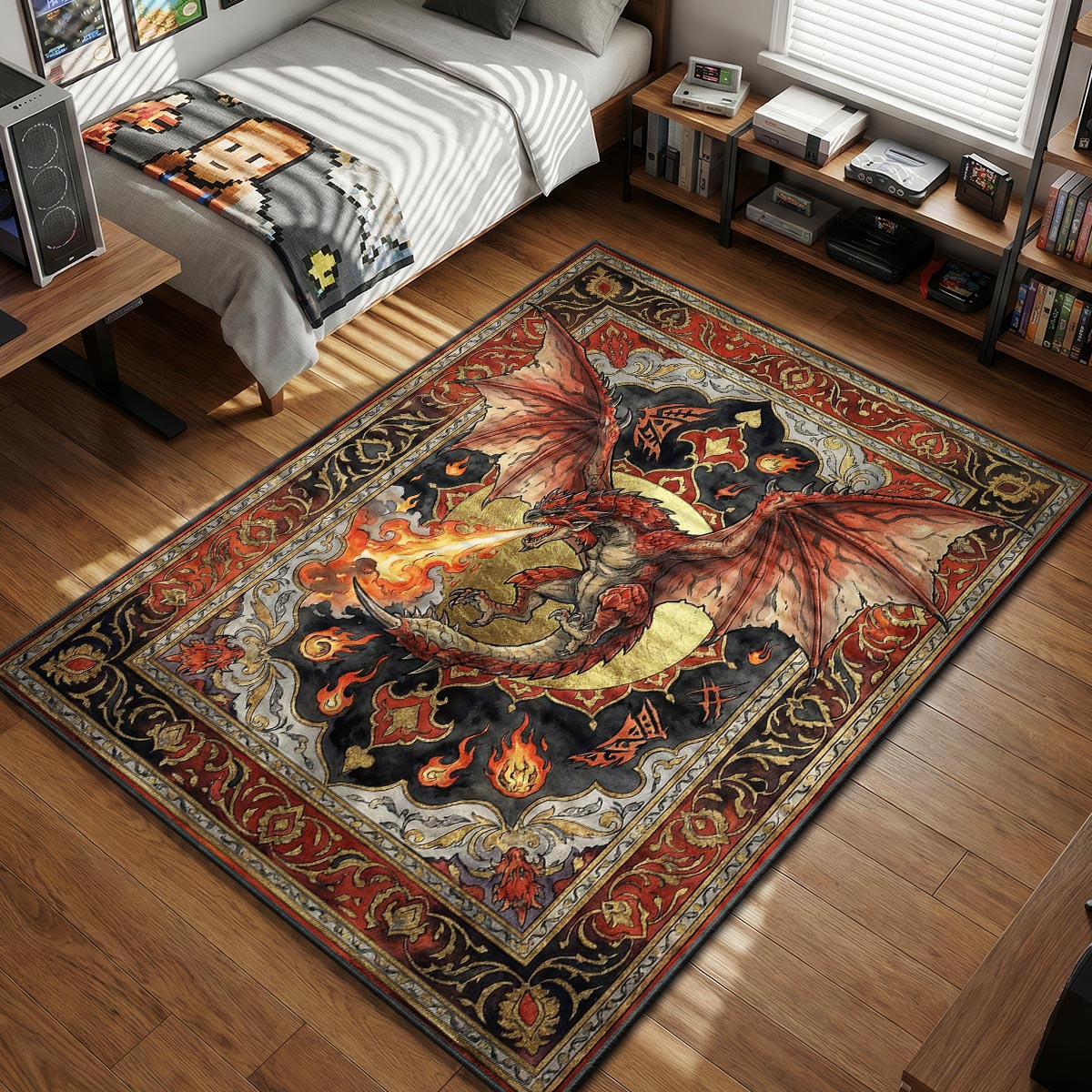 Level up your room's aesthetic with a vibe that screams high-fantasy adventure. Unlike standard neon-soaked gear, this rug offers a sophisticated, medieval tapestry look that fits perfectly in a dedicated RPG corner or a lore-heavy library setup. The rich reds and golds add warmth to your floor, turning a cold room into a cozy Hunter's Hub. It acts as one of those essential non slip rugs that keeps your gear grounded even when the action on screen gets chaotic. It’s art that respects the history of the franchise while serving a modern purpose.