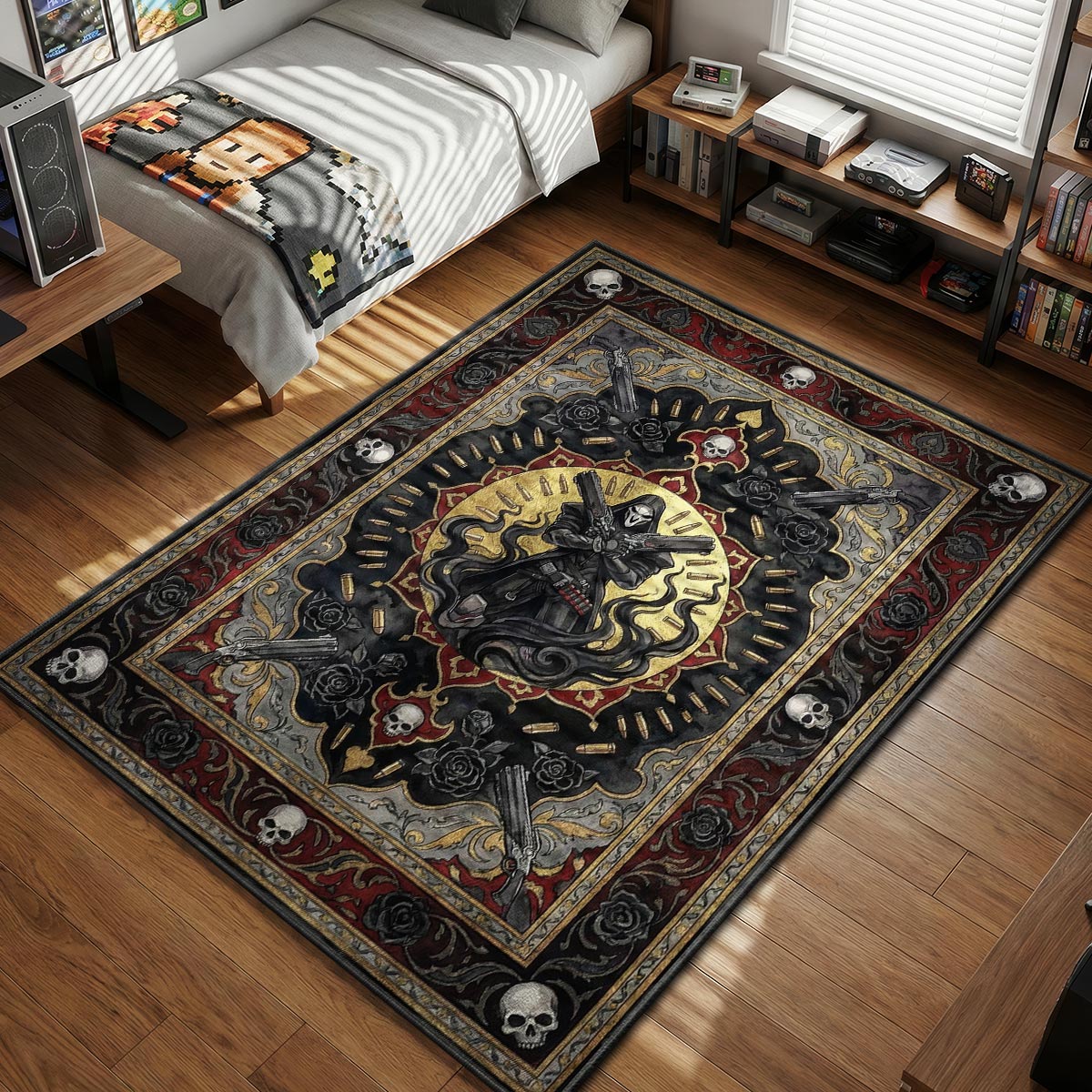 Perfect for setups that favor a darker, moodier vibe, this rug channels a heavy gothic influence mixed with high-end Art Nouveau intricate borders. The deep blacks, blood reds, and antique golds create a "Death" tarot card aesthetic that adds serious character to your room without looking like a cheap poster. It is an ideal centerpiece for a low-light gaming cave, offering a mature and stylish alternative to standard bright merchandise. Elevate your floor with one of our premium non slip rugs that looks as deadly as your aim.