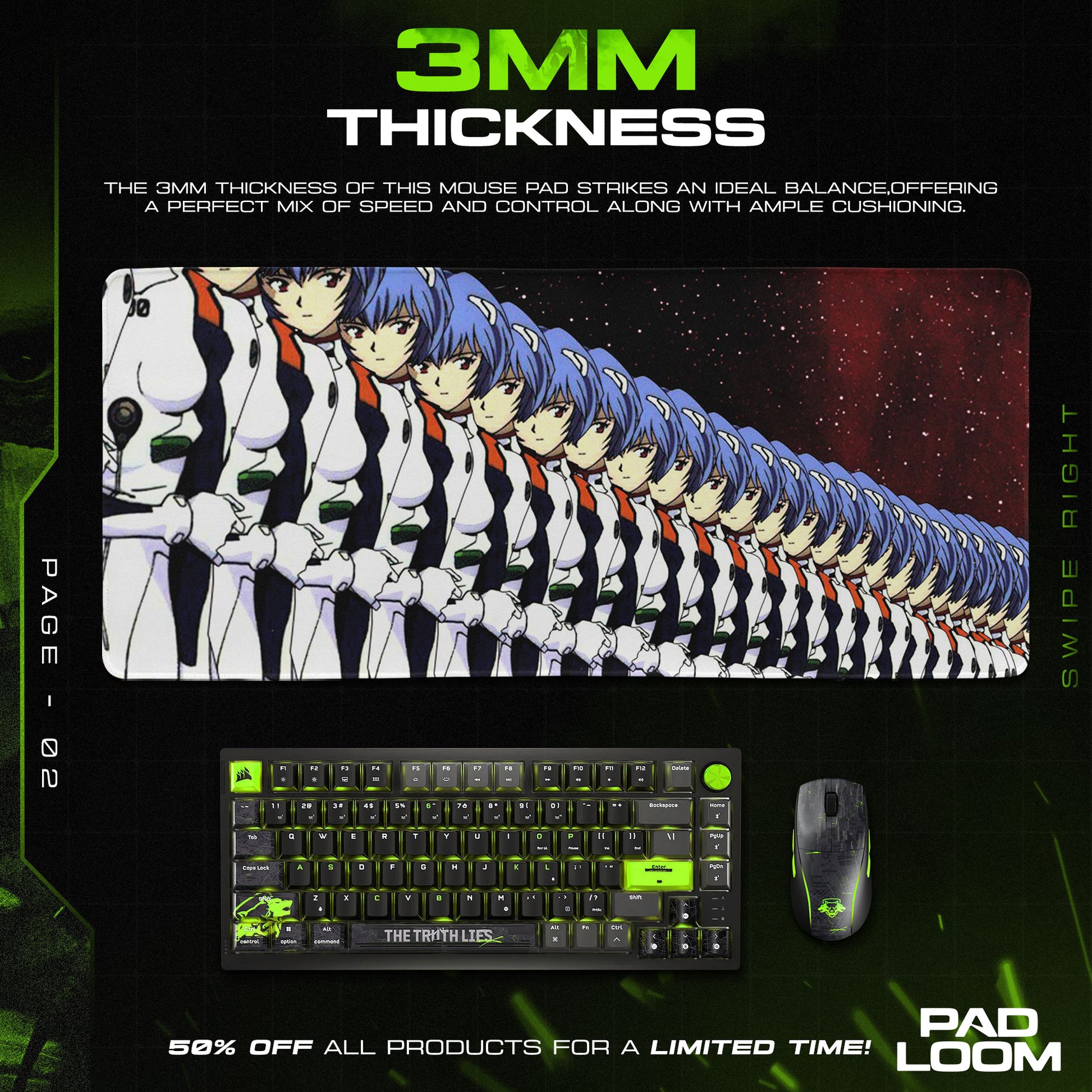 The smooth surface ensures seamless mouse movement, balancing speed and precision for gamers, designers, and professionals alike. Its 3mm thickness offers comfortable cushioning to reduce wrist strain, while the non-slip base anchors the mat firmly during long sessions. The repeating figures of Rei add a hypnotic rhythm to your setup, blending practicality with artistic expression in a way that is uniquely Evangelion. Every detail of the design contributes to a sense of depth and atmosphere that elevates your workspace beyond the ordinary.