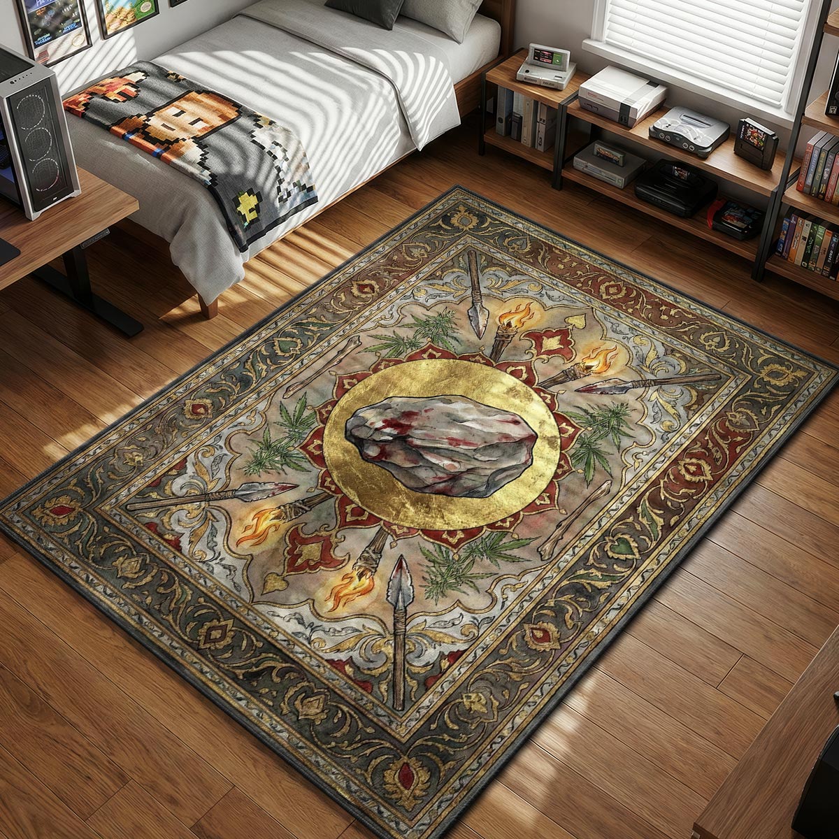 Every wipe begins the same way: you, a torch, and a rock. This rug pays tribute to the most reliable tool in the game, featuring the iconic rock (complete with bloodstains from a fresh spawn fight) as the central crest. Surrounded by crossed wooden spears, lit torches, and essential hemp plants, it immortalizes the chaotic "primitive" phase of the game where every scrap of cloth counts. It’s a nostalgic anchor for your room that reminds you where you came from, no matter how many rockets you have now. Check out our Rust rugs for more essential survival gear.