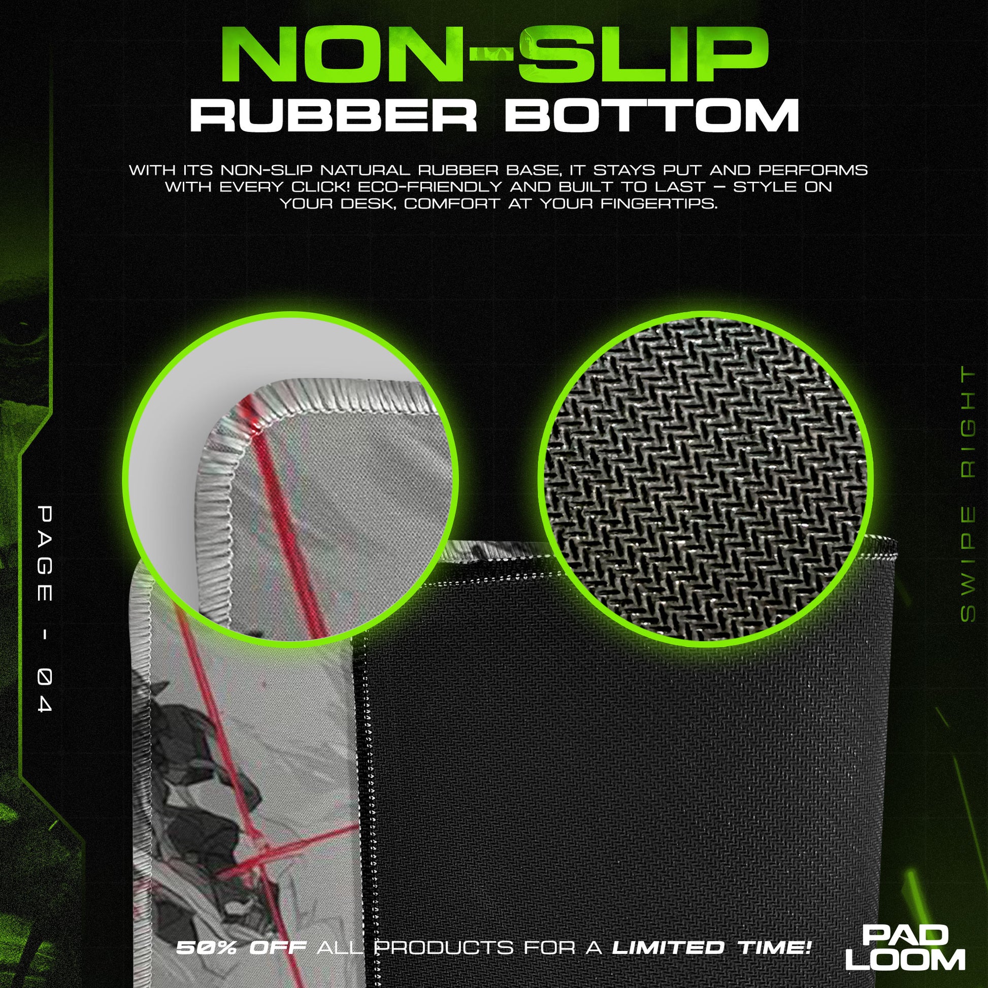 Available in eight versatile sizes — from the compact 11.8”×15.7” (30×40 cm) to the extended 23.6”×47.2” (60×120 cm) — it adapts seamlessly to any gaming or creative workspace. The 3mm thickness strikes the ideal balance between cushioning and control, while the soft micro-woven surface ensures fluid mouse movement. Anti-fray stitched edges maintain the mat’s clean form through years of use, and the non-slip rubber base keeps it perfectly grounded during high-speed action. The fade-resistant print preserves the deep grays and scarlet tones that make this piece visually striking.