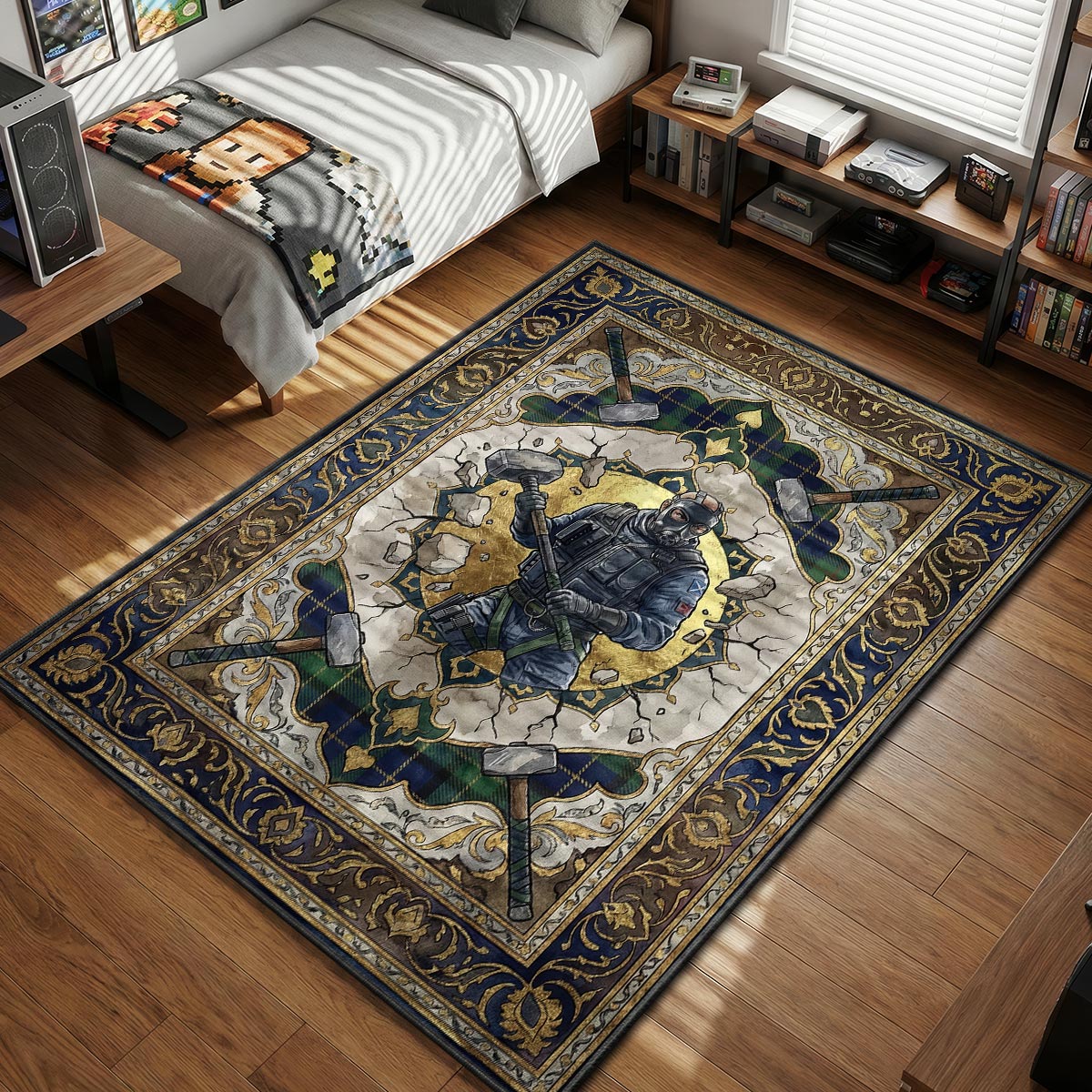 This design brilliantly fuses Sledge's Scottish roots with the grit of tactical warfare. The background features a rich, deep blue and green tartan plaid, paying homage to his heritage, while the ornate gold borders add a layer of classical elegance. Crossed hammers woven into the pattern and the jagged cracks surrounding the operator create a dynamic sense of impact and destruction. It’s a visually striking piece that balances the ruggedness of a breaching operator with the sophistication of high-end decor. Printed on our premium large floor mats, the intricate tartan lines and the texture of the debris are captured in stunning high resolution.