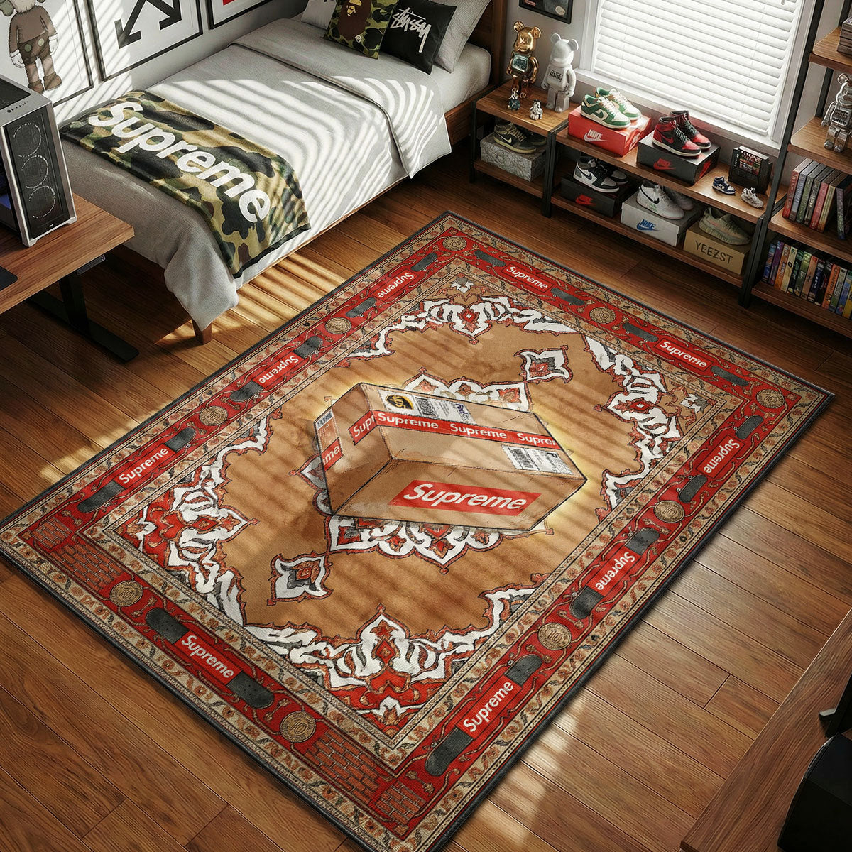 The Supreme Shipping Box Rug turns streetwear packaging into framed wall-worthy art for your floor. Centered on a warm tan and cream baroque medallion, a taped Supreme shipping box sits slightly angled, complete with visible labels and the iconic red box logo. Surrounding it is a bold red border layered with repeating Supreme branding, coin-style graphics, and brick pattern detailing along the base.