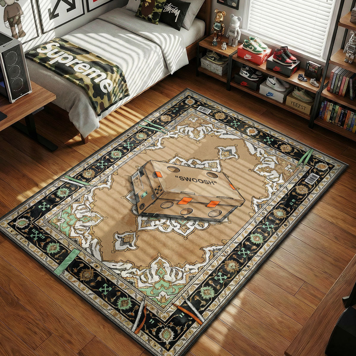 The Swoosh Box Black Border Rug takes a muted baroque base and frames it with darker street energy. At the center sits a tan “Swoosh” shoe box, complete with circular cutouts and signature orange pull tabs. It rests inside a beige and cream medallion, while the outer border shifts to deep black with repeating arrow-style motifs and subtle barcode accents.