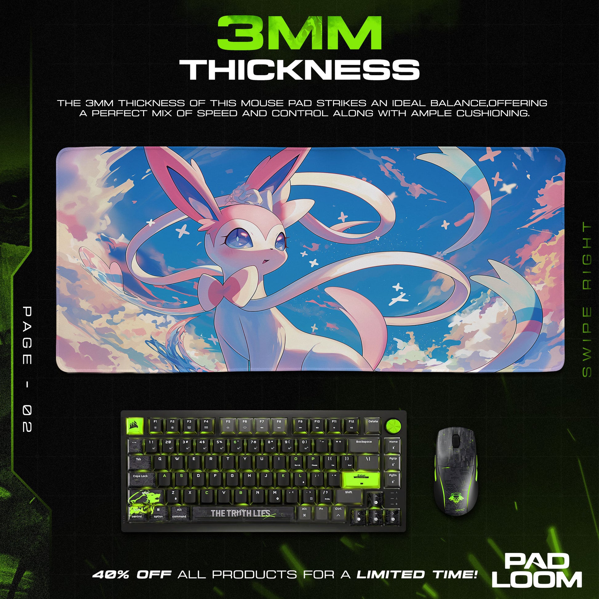 The rubber base holds everything in place, anchoring your flow without interruption. But what truly sets this desk mat apart is its atmosphere: light pours from the clouds, Sylveon’s form framed by ribbons and wind, evoking the feeling of freedom, love, and quiet confidence. It doesn’t overwhelm your space—it lifts it, wrapping your setup in soft color and positive energy.