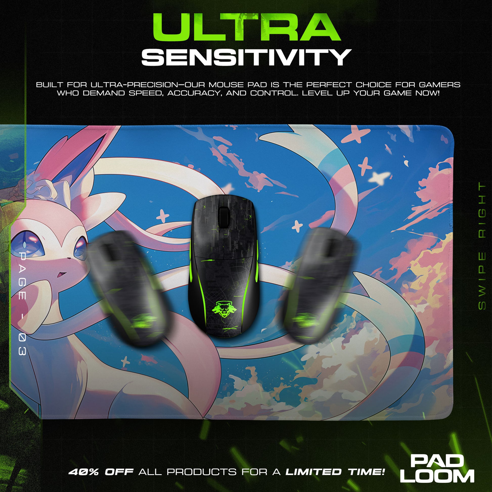 Graceful and radiant, Sylveon rises into the open sky, its ribbons swirling like soft trails of wind in motion. This Pokémon mouse pad captures a moment of pure serenity and subtle power, where vibrant blues meet pastel pinks, and the clouds part just enough to reveal the gentle confidence in Sylveon’s gaze. There’s something peaceful here—something still—but beneath the charm lies a strength that’s calm, deliberate, and unwavering.