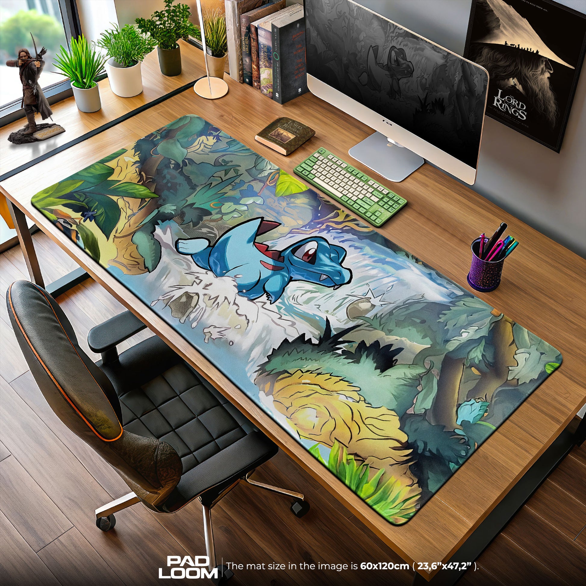 But the real impact is visual. The lush greens and golden light feel like a forest just after rain, and the water looks like it's still moving across the surface. Totodile, always expressive and full of character, feels like the perfect companion in this scene—an emblem of fun, momentum, and fearless curiosity. It’s a mat that doesn’t just sit on your desk; it brings a full ecosystem of energy to it.