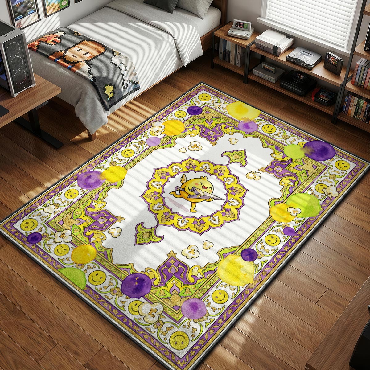 Q: What do the symbols on the border represent? A: The border is a custom "Gekko" motif, featuring smiley faces and popcorn kernels, referencing his idle animations and voice lines, blended into a classic rug pattern.