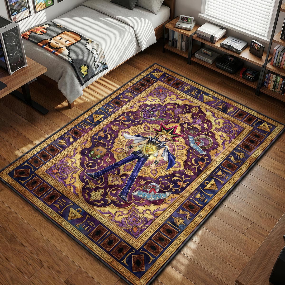 The aesthetic of this rug is deeply regal, utilizing a rich, imperial purple background that symbolizes royalty and mystery. The intricate gold floral patterns are woven around the central character, creating a sophisticated "Persian rug" look. Uniquely, the border is adorned with the backs of Duel Monsters cards and ancient hieroglyphs, turning the perimeter into a tribute to the game's history. This blend of vibrant anime art and classic ornamentation makes it one of our most striking otaku bedroom rugs, perfect for a setup that demands respect.